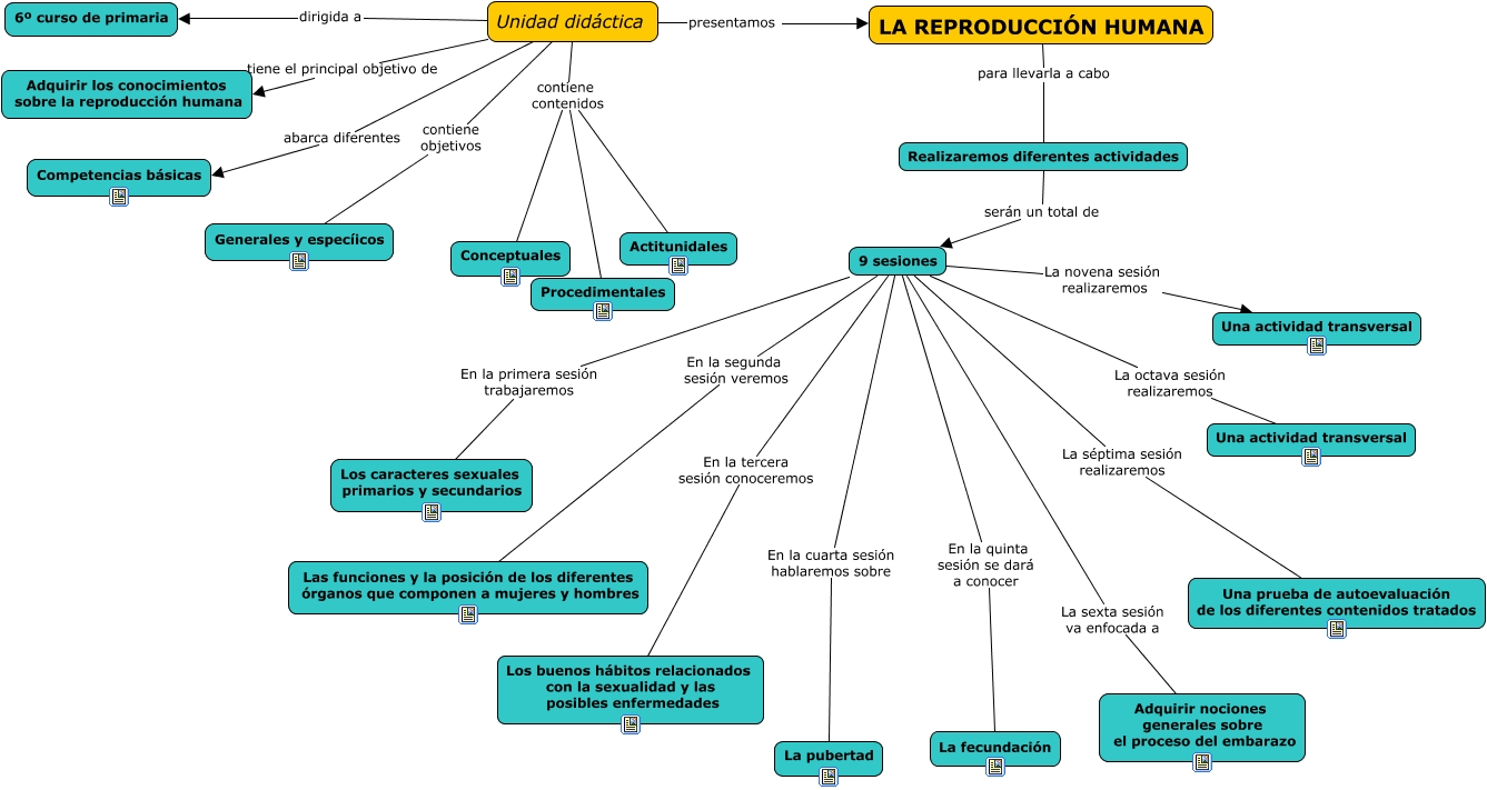 Este Cmap, tiene información relacionada con: La reproducción humana, Unidad didáctica abarca diferentes Competencias básicas, 9 sesiones En la cuarta sesión hablaremos sobre La pubertad, 9 sesiones La sexta sesión va enfocada a Adquirir nociones generales sobre el proceso del embarazo, Unidad didáctica contiene contenidos Procedimentales, 9 sesiones La novena sesión realizaremos Una actividad transversal, Unidad didáctica presentamos LA REPRODUCCIÓN HUMANA, Realizaremos diferentes actividades serán un total de 9 sesiones, Unidad didáctica contiene contenidos Conceptuales, 9 sesiones La séptima sesión realizaremos Una prueba de autoevaluación de los diferentes contenidos tratados, 9 sesiones En la segunda sesión veremos Las funciones y la posición de los diferentes órganos que componen a mujeres y hombres, Unidad didáctica dirigida a 6º curso de primaria, 9 sesiones La octava sesión realizaremos Una actividad transversal, Unidad didáctica contiene objetivos Generales y especíicos, Unidad didáctica tiene el principal objetivo de Adquirir los conocimientos sobre la reproducción humana, 9 sesiones En la quinta sesión se dará a conocer La fecundación, 9 sesiones En la tercera sesión conoceremos Los buenos hábitos relacionados con la sexualidad y las posibles enfermedades, LA REPRODUCCIÓN HUMANA para llevarla a cabo Realizaremos diferentes actividades, Unidad didáctica contiene contenidos Actitunidales, 9 sesiones En la primera sesión trabajaremos Los caracteres sexuales primarios y secundarios