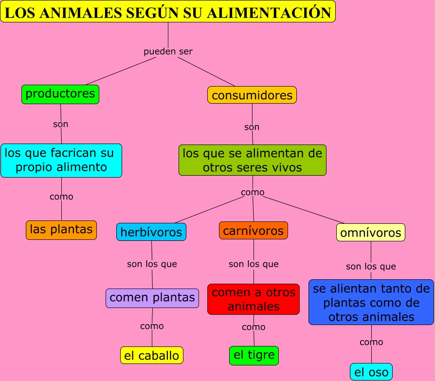 Este Cmap, tiene información relacionada con: Los animales según su alimentación, se alientan tanto de plantas como de otros animales como el oso, productores son los que facrican su propio alimento, consumidores son los que se alimentan de otros seres vivos, comen plantas como el caballo, LOS ANIMALES SEGÚN SU ALIMENTACIÓN pueden ser productores, comen a otros animales como el tigre, omnívoros son los que se alientan tanto de plantas como de otros animales, herbívoros son los que comen plantas, LOS ANIMALES SEGÚN SU ALIMENTACIÓN pueden ser consumidores, los que facrican su propio alimento como las plantas, los que se alimentan de otros seres vivos como herbívoros, los que se alimentan de otros seres vivos como omnívoros, los que se alimentan de otros seres vivos como carnívoros, carnívoros son los que comen a otros animales
