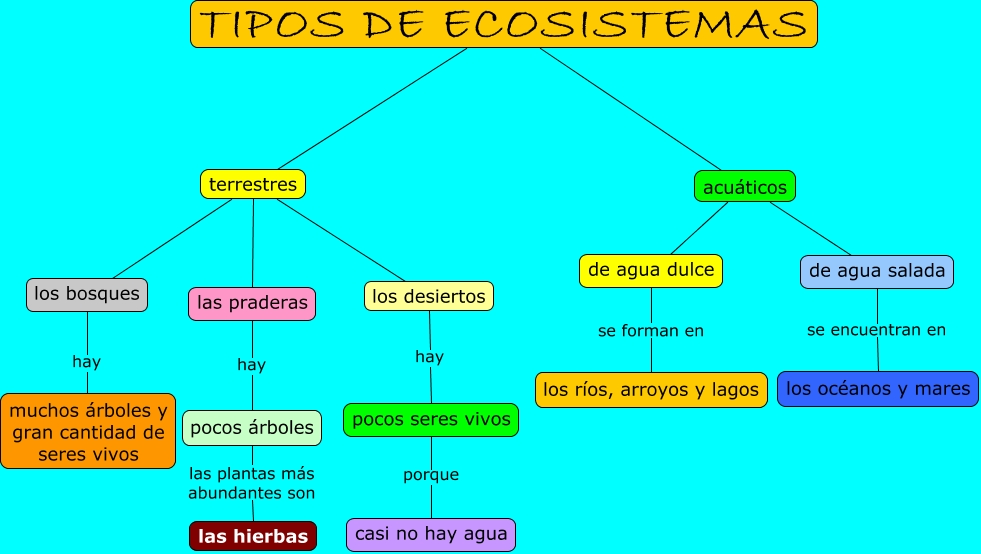 Este Cmap, tiene información relacionada con: Tipos de ecosistemas, TIPOS DE ECOSISTEMAS acuáticos, las praderas hay pocos árboles, TIPOS DE ECOSISTEMAS terrestres, los bosques hay muchos árboles y gran cantidad de seres vivos, terrestres las praderas, pocos árboles las plantas más abundantes son las hierbas, de agua dulce se forman en los ríos, arroyos y lagos, los desiertos hay pocos seres vivos, terrestres los bosques, terrestres los desiertos, pocos seres vivos porque casi no hay agua, acuáticos de agua dulce, de agua salada se encuentran en los océanos y mares, acuáticos de agua salada