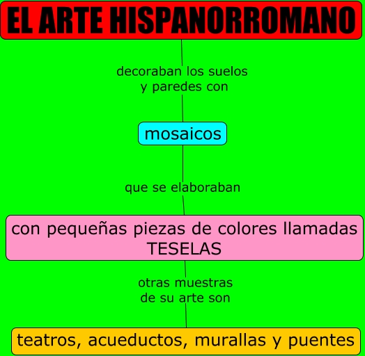 Este Cmap, tiene información relacionada con: El arte hispanorromano, con pequeñas piezas de colores llamadas TESELAS otras muestras de su arte son teatros, acueductos, murallas y puentes, mosaicos que se elaboraban con pequeñas piezas de colores llamadas TESELAS, EL ARTE HISPANORROMANO decoraban los suelos y paredes con mosaicos