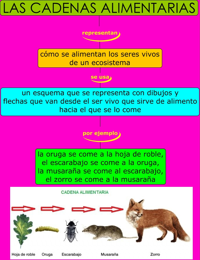 Este Cmap, tiene información relacionada con: Las cadenas alimentarias, un esquema que se representa con dibujos y flechas que van desde el ser vivo que sirve de alimento hacia el que se lo come por ejemplo la oruga se come a la hoja de roble, el escarabajo se come a la oruga, la musaraña se come al escarabajo, el zorro se come a la musaraña, LAS CADENAS ALIMENTARIAS representan cómo se alimentan los seres vivos de un ecosistema, cómo se alimentan los seres vivos de un ecosistema se usa un esquema que se representa con dibujos y flechas que van desde el ser vivo que sirve de alimento hacia el que se lo come