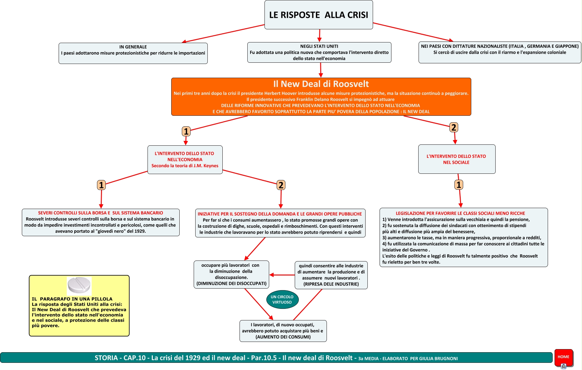 Questa Cmap, creata con IHMC CmapTools, contiene informazioni relative a: STORIA - Par.10.5 - IL new deal di Roosvelt - GB 3a media, occupare più lavoratori con la diminuzione della disoccupazione. (DIMINUZIONE DEI DISOCCUPATI) ???? I lavoratori, di nuovo occupati, avrebbero potuto acquistare più beni e (AUMENTO DEI CONSUMI), L'INTERVENTO DELLO STATO NEL SOCIALE 1 LEGISLAZIONE PER FAVORIRE LE CLASSI SOCIALI MENO RICCHE 1) Venne introdotta l'assicurazione sulla vecchiaia e quindi la pensione, 2) fu sostenuta la diffusione dei sindacati con ottenimento di stipendi più alti e diffusione più ampia del benessere, 3) aumentarono le tasse, ma in maniera progressiva, proporzionale a redditi, 4) fu utilizzata la comunicazione di massa per far conoscere ai cittadini tutte le iniziative del Governo . L'esito delle politiche e leggi di Roosvelt fu talmente positivo che Roosvelt fu rieletto per ben tre volte., LE RISPOSTE ALLA CRISI ???? NEI PAESI CON DITTATURE NAZIONALISTE (ITALIA , GERMANIA E GIAPPONE) Si cercò di uscire dalla crisi con il riarmo e l'espansione coloniale, I lavoratori, di nuovo occupati, avrebbero potuto acquistare più beni e (AUMENTO DEI CONSUMI) ???? quindi consentire alle industrie di aumentare la produzione e di assumere nuovi lavoratori . (RIPRESA DELE INDUSTRIE), LE RISPOSTE ALLA CRISI ???? NEGLI STATI UNITI Fu adottata una politica nuova che comportava l'intervento diretto dello stato nell'economia, Il New Deal di Roosvelt Nei primi tre anni dopo la crisi il presidente Herbert Hoover introdusse alcune misure protezionistiche, ma la situazione continuò a peggiorare. Il presidente successivo Franklin Delano Roosvelt si impegnò ad attuare DELLE RIFORME INNOVATIVE CHE PREVEDEVANO L'INTERVENTO DELLO STATO NELL'ECONOMIA E CHE AVREBBERO FAVORITO SOPRATTUTTO LA PARTE PIU' POVERA DELLA POPOLAZIONE : IL NEW DEAL 2 L'INTERVENTO DELLO STATO NEL SOCIALE, Il New Deal di Roosvelt Nei primi tre anni dopo la crisi il presidente Herbert Hoover introdusse alcune misure protezionistiche, ma la situazione continuò a peggiorare. Il presidente successivo Franklin Delano Roosvelt si impegnò ad attuare DELLE RIFORME INNOVATIVE CHE PREVEDEVANO L'INTERVENTO DELLO STATO NELL'ECONOMIA E CHE AVREBBERO FAVORITO SOPRATTUTTO LA PARTE PIU' POVERA DELLA POPOLAZIONE : IL NEW DEAL 1 L'INTERVENTO DELLO STATO NELL'ECONOMIA Secondo la teoria di J.M. Keynes, L'INTERVENTO DELLO STATO NELL'ECONOMIA Secondo la teoria di J.M. Keynes 2 INIZIATIVE PER IL SOSTEGNO DELLA DOMANDA E LE GRANDI OPERE PUBBLICHE Per far si che i consumi aumentassero , lo stato promosse grandi opere con la costruzione di dighe, scuole, ospedali e rimboschimenti. Con questi interventi le industrie che lavoravano per lo stato avrebbero potuto riprendersi e quindi, L'INTERVENTO DELLO STATO NELL'ECONOMIA Secondo la teoria di J.M. Keynes 1 SEVERI CONTROLLI SULLA BORSA E SUL SISTEMA BANCARIO Roosvelt introdusse severi controlli sulla borsa e sul sistema bancario in modo da impedire investimenti incontrollati e pericolosi, come quelli che avevano portato al "giovedì nero" del 1929., quindi consentire alle industrie di aumentare la produzione e di assumere nuovi lavoratori . (RIPRESA DELE INDUSTRIE) ???? occupare più lavoratori con la diminuzione della disoccupazione. (DIMINUZIONE DEI DISOCCUPATI), LE RISPOSTE ALLA CRISI ???? IN GENERALE I paesi adottarono misure protezionistiche per ridurre le importazioni, NEGLI STATI UNITI Fu adottata una politica nuova che comportava l'intervento diretto dello stato nell'economia ???? Il New Deal di Roosvelt Nei primi tre anni dopo la crisi il presidente Herbert Hoover introdusse alcune misure protezionistiche, ma la situazione continuò a peggiorare. Il presidente successivo Franklin Delano Roosvelt si impegnò ad attuare DELLE RIFORME INNOVATIVE CHE PREVEDEVANO L'INTERVENTO DELLO STATO NELL'ECONOMIA E CHE AVREBBERO FAVORITO SOPRATTUTTO LA PARTE PIU' POVERA DELLA POPOLAZIONE : IL NEW DEAL, INIZIATIVE PER IL SOSTEGNO DELLA DOMANDA E LE GRANDI OPERE PUBBLICHE Per far si che i consumi aumentassero , lo stato promosse grandi opere con la costruzione di dighe, scuole, ospedali e rimboschimenti. Con questi interventi le industrie che lavoravano per lo stato avrebbero potuto riprendersi e quindi ???? occupare più lavoratori con la diminuzione della disoccupazione. (DIMINUZIONE DEI DISOCCUPATI)