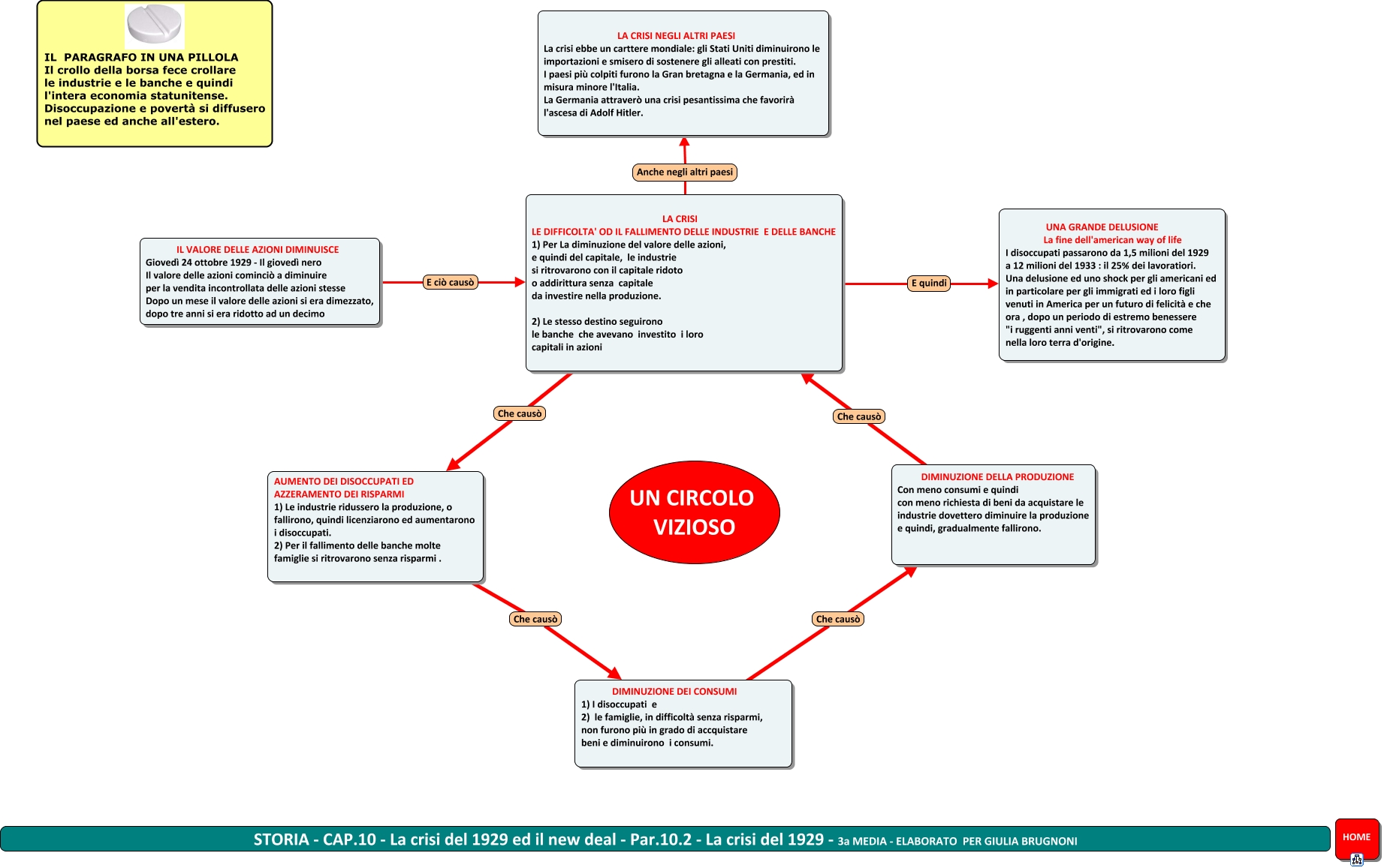Questa Cmap, creata con IHMC CmapTools, contiene informazioni relative a: STORIA - Par.10.2 - La crisi del 1929 - GB 3a media, LA CRISI LE DIFFICOLTA' OD IL FALLIMENTO DELLE INDUSTRIE E DELLE BANCHE 1) Per La diminuzione del valore delle azioni, e quindi del capitale, le industrie si ritrovarono con il capitale ridoto o addirittura senza capitale da investire nella produzione. 2) Le stesso destino seguirono le banche che avevano investito i loro capitali in azioni Che causò AUMENTO DEI DISOCCUPATI ED AZZERAMENTO DEI RISPARMI 1) Le industrie ridussero la produzione, o fallirono, quindi licenziarono ed aumentarono i disoccupati. 2) Per il fallimento delle banche molte famiglie si ritrovarono senza risparmi ., AUMENTO DEI DISOCCUPATI ED AZZERAMENTO DEI RISPARMI 1) Le industrie ridussero la produzione, o fallirono, quindi licenziarono ed aumentarono i disoccupati. 2) Per il fallimento delle banche molte famiglie si ritrovarono senza risparmi . Che causò DIMINUZIONE DEI CONSUMI 1) I disoccupati e 2) le famiglie, in difficoltà senza risparmi, non furono più in grado di accquistare beni e diminuirono i consumi., IL VALORE DELLE AZIONI DIMINUISCE Giovedì 24 ottobre 1929 - Il giovedì nero Il valore delle azioni cominciò a diminuire per la vendita incontrollata delle azioni stesse Dopo un mese il valore delle azioni si era dimezzato, dopo tre anni si era ridotto ad un decimo E ciò causò LA CRISI LE DIFFICOLTA' OD IL FALLIMENTO DELLE INDUSTRIE E DELLE BANCHE 1) Per La diminuzione del valore delle azioni, e quindi del capitale, le industrie si ritrovarono con il capitale ridoto o addirittura senza capitale da investire nella produzione. 2) Le stesso destino seguirono le banche che avevano investito i loro capitali in azioni, DIMINUZIONE DEI CONSUMI 1) I disoccupati e 2) le famiglie, in difficoltà senza risparmi, non furono più in grado di accquistare beni e diminuirono i consumi. Che causò DIMINUZIONE DELLA PRODUZIONE Con meno consumi e quindi con meno richiesta di beni da acquistare le industrie dovettero diminuire la produzione e quindi, gradualmente fallirono., LA CRISI LE DIFFICOLTA' OD IL FALLIMENTO DELLE INDUSTRIE E DELLE BANCHE 1) Per La diminuzione del valore delle azioni, e quindi del capitale, le industrie si ritrovarono con il capitale ridoto o addirittura senza capitale da investire nella produzione. 2) Le stesso destino seguirono le banche che avevano investito i loro capitali in azioni E quindi UNA GRANDE DELUSIONE La fine dell'american way of life I disoccupati passarono da 1,5 milioni del 1929 a 12 milioni del 1933 : il 25% dei lavoratiori. Una delusione ed uno shock per gli americani ed in particolare per gli immigrati ed i loro figli venuti in America per un futuro di felicità e che ora , dopo un periodo di estremo benessere "i ruggenti anni venti", si ritrovarono come nella loro terra d'origine., LA CRISI LE DIFFICOLTA' OD IL FALLIMENTO DELLE INDUSTRIE E DELLE BANCHE 1) Per La diminuzione del valore delle azioni, e quindi del capitale, le industrie si ritrovarono con il capitale ridoto o addirittura senza capitale da investire nella produzione. 2) Le stesso destino seguirono le banche che avevano investito i loro capitali in azioni Anche negli altri paesi LA CRISI NEGLI ALTRI PAESI La crisi ebbe un carttere mondiale: gli Stati Uniti diminuirono le importazioni e smisero di sostenere gli alleati con prestiti. I paesi più colpiti furono la Gran bretagna e la Germania, ed in misura minore l'Italia. La Germania attraverò una crisi pesantissima che favorirà l'ascesa di Adolf Hitler., DIMINUZIONE DELLA PRODUZIONE Con meno consumi e quindi con meno richiesta di beni da acquistare le industrie dovettero diminuire la produzione e quindi, gradualmente fallirono. Che causò LA CRISI LE DIFFICOLTA' OD IL FALLIMENTO DELLE INDUSTRIE E DELLE BANCHE 1) Per La diminuzione del valore delle azioni, e quindi del capitale, le industrie si ritrovarono con il capitale ridoto o addirittura senza capitale da investire nella produzione. 2) Le stesso destino seguirono le banche che avevano investito i loro capitali in azioni