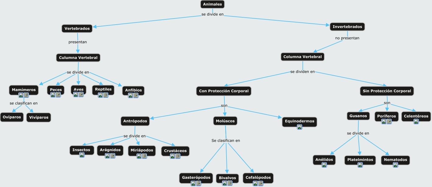 Este Cmap, tiene información relacionada con: Animales, Antrópodos se divide en Crustáceos, Animales se divide en Vertebrados, Sin Protección Corporal son Gusanos, Culumna Vertebral se divide en Peces, Molúscos Se clasifican en Cefalópodos, Sin Protección Corporal son Celentéreos, Gusanos se divide en Platelmintos, Mamímeros se clasifican en Ovíparos, Culumna Vertebral se divide en Aves, Gusanos se divide en Nematodos, Antrópodos se divide en Miriápodos, Mamímeros se clasifican en Vivíparos, Con Protección Corporal son Molúscos, Con Protección Corporal son Equinodermos, Con Protección Corporal son Antrópodos, Culumna Vertebral se divide en Reptiles, Culumna Vertebral se divide en Anfibios, Columna Vertebral se dividen en Con Protección Corporal, Antrópodos se divide en Arágnidos, Molúscos Se clasifican en Bivalvos