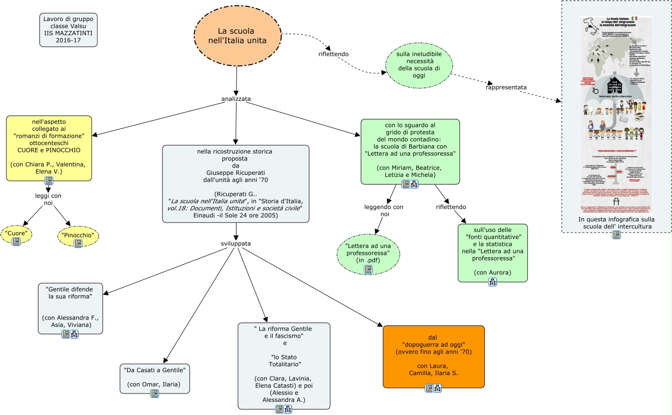 Questa Cmap, creata con IHMC CmapTools, contiene informazioni relative a: La scuola nell'Italia unita, con lo sguardo al grido di protesta del mondo contadino: la scuola di Barbiana con "Lettera ad una professoressa" (con Miriam, Beatrice, Letizia e Michela) leggendo con noi "Lettera ad una professoressa" (in .pdf), sulla ineludibile necessità della scuola di oggi rappresentata In questa infografica sulla scuola dell' intercultura, nella ricostruzione storica proposta da Giuseppe Ricuperati dall'unità agli anni '70 (Ricuperati G.. "La scuola nell'Italia unita", in "Storia d'Italia, vol.18: Documenti, Istituzioni e società civile" Einaudi -il Sole 24 ore 2005) sviluppata "Da Casati a Gentile" (con Omar, Ilaria), nella ricostruzione storica proposta da Giuseppe Ricuperati dall'unità agli anni '70 (Ricuperati G.. "La scuola nell'Italia unita", in "Storia d'Italia, vol.18: Documenti, Istituzioni e società civile" Einaudi -il Sole 24 ore 2005) sviluppata "Gentile difende la sua riforma" (con Alessandra F., Asia, Viviana), La scuola nell'Italia unita analizzata nell'aspetto collegato ai "romanzi di formazione" ottocenteschi CUORE e PINOCCHIO (con Chiara P., Valentina, Elena V.), nella ricostruzione storica proposta da Giuseppe Ricuperati dall'unità agli anni '70 (Ricuperati G.. "La scuola nell'Italia unita", in "Storia d'Italia, vol.18: Documenti, Istituzioni e società civile" Einaudi -il Sole 24 ore 2005) sviluppata " La riforma Gentile e il fascismo" e "lo Stato Totalitario" (con Clara, Lavinia, Elena Catasti) e poi (Alessio e Alessandra A.), La scuola nell'Italia unita riflettendo sulla ineludibile necessità della scuola di oggi, nell'aspetto collegato ai "romanzi di formazione" ottocenteschi CUORE e PINOCCHIO (con Chiara P., Valentina, Elena V.) leggi con noi "Pinocchio", La scuola nell'Italia unita analizzata nella ricostruzione storica proposta da Giuseppe Ricuperati dall'unità agli anni '70 (Ricuperati G.. "La scuola nell'Italia unita", in "Storia d'Italia, vol.18: Documenti, Istituzioni e società civile" Einaudi -il Sole 24 ore 2005), nella ricostruzione storica proposta da Giuseppe Ricuperati dall'unità agli anni '70 (Ricuperati G.. "La scuola nell'Italia unita", in "Storia d'Italia, vol.18: Documenti, Istituzioni e società civile" Einaudi -il Sole 24 ore 2005) sviluppata dal "dopoguerra ad oggi" (ovvero fino agli anni '70) con Laura, Camilla, Ilaria S., nell'aspetto collegato ai "romanzi di formazione" ottocenteschi CUORE e PINOCCHIO (con Chiara P., Valentina, Elena V.) leggi con noi "Cuore", La scuola nell'Italia unita analizzata con lo sguardo al grido di protesta del mondo contadino: la scuola di Barbiana con "Lettera ad una professoressa" (con Miriam, Beatrice, Letizia e Michela), con lo sguardo al grido di protesta del mondo contadino: la scuola di Barbiana con "Lettera ad una professoressa" (con Miriam, Beatrice, Letizia e Michela) riflettendo sull'uso delle "fonti quantitative" e la statistica nella "Lettera ad una professoressa" (con Aurora)