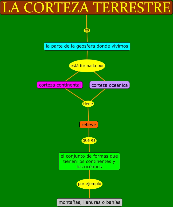 Este Cmap, tiene información relacionada con: La corteza terrestre, el conjunto de formas que tienen los continentes y los océanos por ejemplo montañas, llanuras o bahías, LA CORTEZA TERRESTRE es la parte de la geosfera donde vivimos, corteza oceánica tiene relieve, corteza continental tiene relieve, relieve que es el conjunto de formas que tienen los continentes y los océanos, la parte de la geosfera donde vivimos está formada por corteza oceánica, la parte de la geosfera donde vivimos está formada por corteza continental