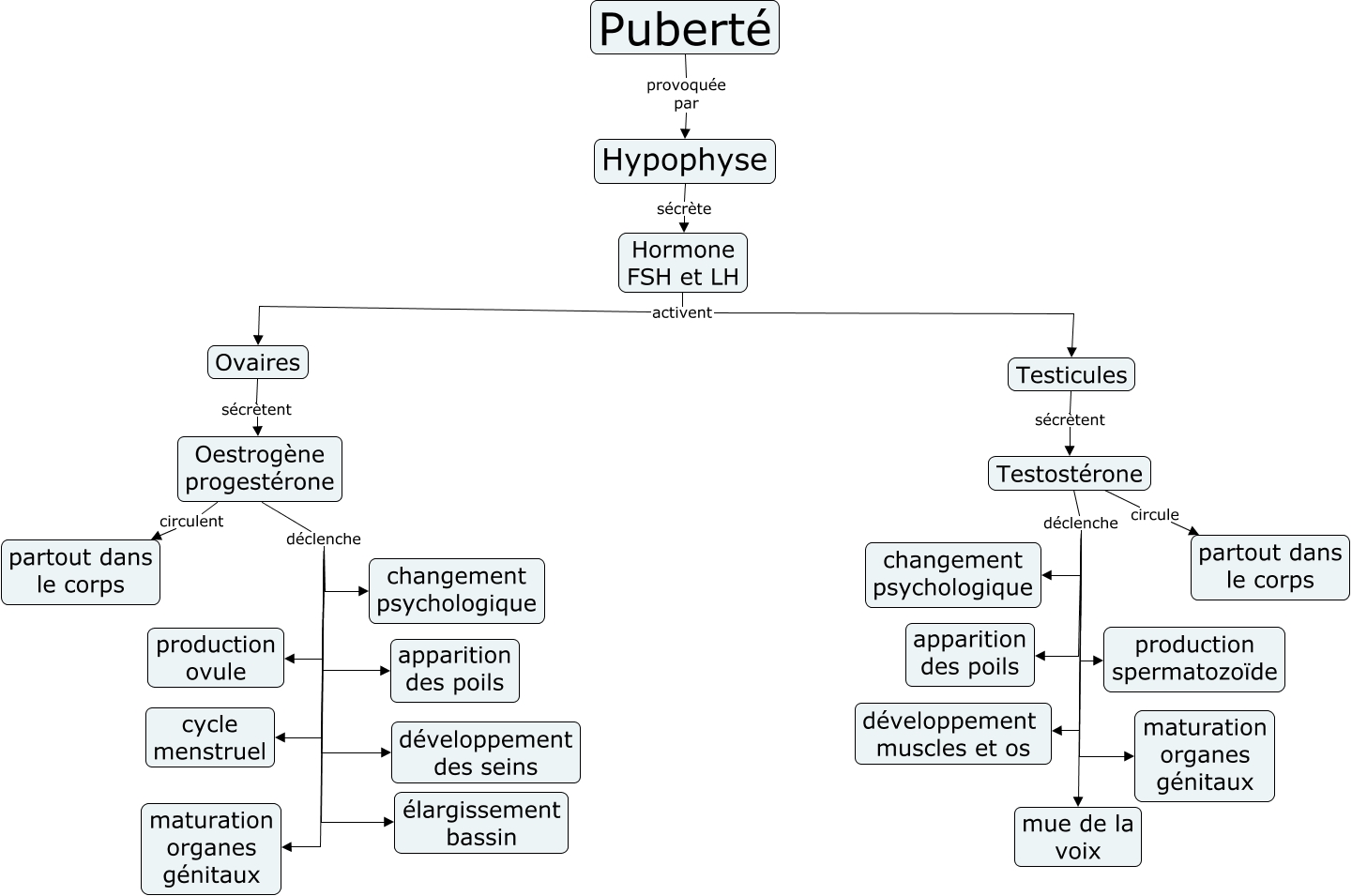 Cette carte de concepts créée avec IHMC CmapTools traite de: puberté, Testostérone déclenche développement muscles et os, Hypophyse sécrète Hormone FSH et LH, Testostérone déclenche production spermatozoïde, Oestrogène progestérone déclenche développement des seins, Oestrogène progestérone déclenche production ovule, Puberté provoquée par Hypophyse, Oestrogène progestérone déclenche maturation organes génitaux, Testostérone déclenche mue de la voix, Hormone FSH et LH activent Testicules, Testostérone déclenche changement psychologique, Testostérone déclenche maturation organes génitaux, Hormone FSH et LH activent Ovaires, Oestrogène progestérone déclenche élargissement bassin, Oestrogène progestérone déclenche changement psychologique, Oestrogène progestérone déclenche cycle menstruel, Oestrogène progestérone circulent partout dans le corps, Ovaires sécrètent Oestrogène progestérone, Testostérone déclenche apparition des poils, Testicules sécrètent Testostérone, Oestrogène progestérone déclenche apparition des poils