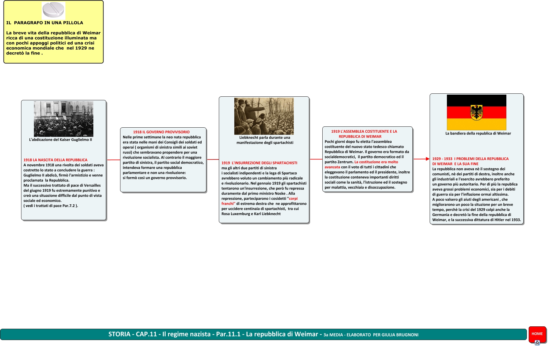 Questa Cmap, creata con IHMC CmapTools, contiene informazioni relative a: STORIA - Par.11.1 - La repubblica di Weimar - GB 3a media, L'abdicazione del Kaiser Guglielmo II 1918 LA NASCITA DELLA REPUBBLICA A novembre 1918 una rivolta dei soldati aveva costretto lo stato a concludere la guerra : Guglielmo II abdicò, firmò l'armistizio e venne proclamata la Repubblica. Ma il successivo trattato di pace di Versailles del giugno 1919 fu estremamente punitivo e creò una situazione difficile dal punto di vista sociale ed economico. ( vedi i trattati di pace Par.7.2 ). ???? La bandiera della republica di Weimar 1929 - 1933 I PROBLEMI DELLA REPUBBLICA DI WEIMAR E LA SUA FINE La repubblica non aveva nè il sostegno dei comunisti, nè dei partiti di destra, inoltre anche gli industriali e l'esercito avrebbero preferito un governo più autoritario. Per di più la republica aveva grossi problemi economici, sia per i debiti di guerra sia per l'inflazione ormai altissima. A poco valsero gli aiuti degli americani , che migliorarono un poco la situzione per un breve tempo, perchè la crisi del 1929 colpì anche la Germania e decretò la fine della repubblica di Weimar, e la successiva dittatura di Hitler nel 1933.