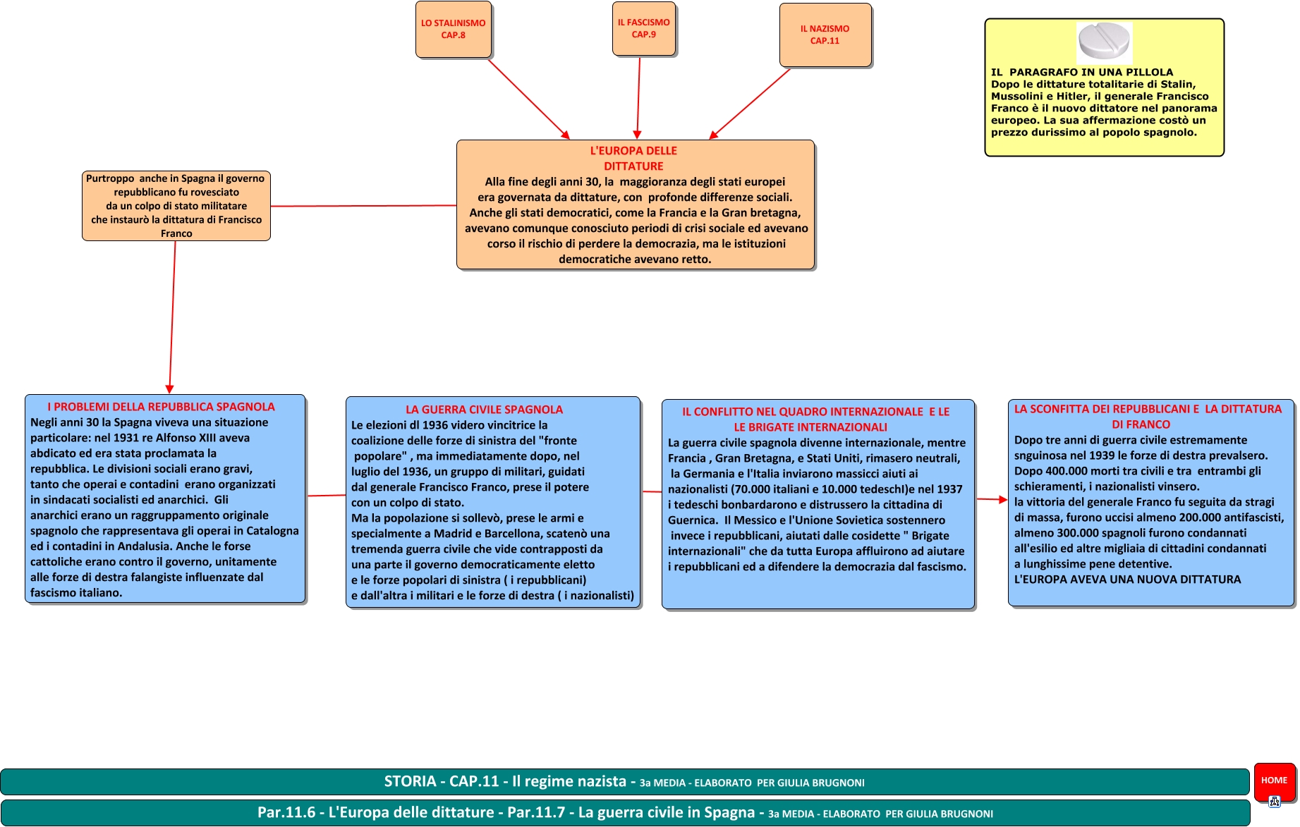 Questa Cmap, creata con IHMC CmapTools, contiene informazioni relative a: STORIA - Par.11.6 - L'Europa delle dittature - Par.11.7 - La guerra civile in Spagna - GB 3a media, I PROBLEMI DELLA REPUBBLICA SPAGNOLA Negli anni 30 la Spagna viveva una situazione particolare: nel 1931 re Alfonso XIII aveva abdicato ed era stata proclamata la repubblica. Le divisioni sociali erano gravi, tanto che operai e contadini erano organizzati in sindacati socialisti ed anarchici. Gli anarchici erano un raggruppamento originale spagnolo che rappresentava gli operai in Catalogna ed i contadini in Andalusia. Anche le forse cattoliche erano contro il governo, unitamente alle forze di destra falangiste influenzate dal fascismo italiano. ???? LA SCONFITTA DEI REPUBBLICANI E LA DITTATURA DI FRANCO Dopo tre anni di guerra civile estremamente snguinosa nel 1939 le forze di destra prevalsero. Dopo 400.000 morti tra civili e tra entrambi gli schieramenti, i nazionalisti vinsero. la vittoria del generale Franco fu seguita da stragi di massa, furono uccisi almeno 200.000 antifascisti, almeno 300.000 spagnoli furono condannati all'esilio ed altre migliaia di cittadini condannati a lunghissime pene detentive. L'EUROPA AVEVA UNA NUOVA DITTATURA, IL NAZISMO CAP.11 ???? L'EUROPA DELLE DITTATURE Alla fine degli anni 30, la maggioranza degli stati europei era governata da dittature, con profonde differenze sociali. Anche gli stati democratici, come la Francia e la Gran bretagna, avevano comunque conosciuto periodi di crisi sociale ed avevano corso il rischio di perdere la democrazia, ma le istituzioni democratiche avevano retto., L'EUROPA DELLE DITTATURE Alla fine degli anni 30, la maggioranza degli stati europei era governata da dittature, con profonde differenze sociali. Anche gli stati democratici, come la Francia e la Gran bretagna, avevano comunque conosciuto periodi di crisi sociale ed avevano corso il rischio di perdere la democrazia, ma le istituzioni democratiche avevano retto. Purtroppo anche in Spagna il governo repubblicano fu rovesciato da un colpo di stato militatare che instaurò la dittatura di Francisco Franco I PROBLEMI DELLA REPUBBLICA SPAGNOLA Negli anni 30 la Spagna viveva una situazione particolare: nel 1931 re Alfonso XIII aveva abdicato ed era stata proclamata la repubblica. Le divisioni sociali erano gravi, tanto che operai e contadini erano organizzati in sindacati socialisti ed anarchici. Gli anarchici erano un raggruppamento originale spagnolo che rappresentava gli operai in Catalogna ed i contadini in Andalusia. Anche le forse cattoliche erano contro il governo, unitamente alle forze di destra falangiste influenzate dal fascismo italiano., LO STALINISMO CAP.8 ???? L'EUROPA DELLE DITTATURE Alla fine degli anni 30, la maggioranza degli stati europei era governata da dittature, con profonde differenze sociali. Anche gli stati democratici, come la Francia e la Gran bretagna, avevano comunque conosciuto periodi di crisi sociale ed avevano corso il rischio di perdere la democrazia, ma le istituzioni democratiche avevano retto., IL FASCISMO CAP.9 ???? L'EUROPA DELLE DITTATURE Alla fine degli anni 30, la maggioranza degli stati europei era governata da dittature, con profonde differenze sociali. Anche gli stati democratici, come la Francia e la Gran bretagna, avevano comunque conosciuto periodi di crisi sociale ed avevano corso il rischio di perdere la democrazia, ma le istituzioni democratiche avevano retto.