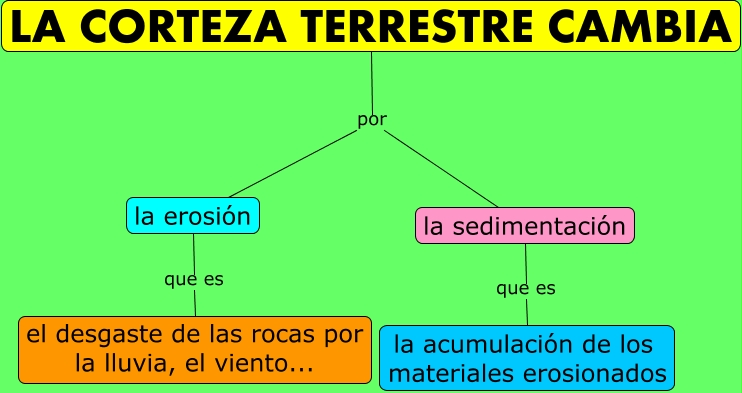 Este Cmap, tiene información relacionada con: La corteza terrestre cambia, la erosión que es el desgaste de las rocas por la lluvia, el viento..., LA CORTEZA TERRESTRE CAMBIA por la sedimentación, la sedimentación que es la acumulación de los materiales erosionados, LA CORTEZA TERRESTRE CAMBIA por la erosión