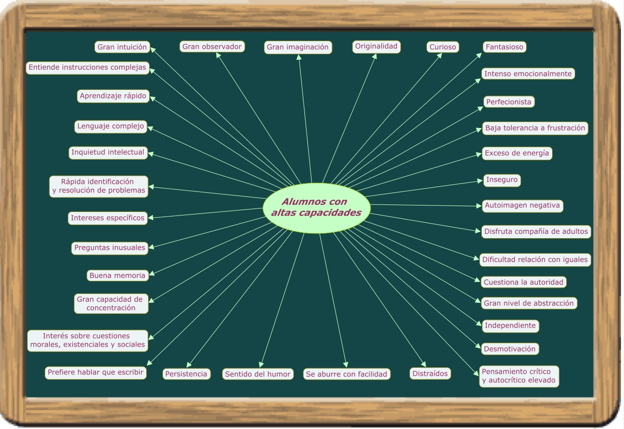 Este Cmap, tiene información relacionada con: Altas capacidades, Alumnos con altas capacidades ???? Intenso emocionalmente, Alumnos con altas capacidades ???? Prefiere hablar que escribir, Alumnos con altas capacidades ???? Entiende instrucciones complejas, Alumnos con altas capacidades ???? Desmotivación, Alumnos con altas capacidades ???? Originalidad, Alumnos con altas capacidades ???? Inseguro, Alumnos con altas capacidades ???? Gran observador, Alumnos con altas capacidades ???? Persistencia, Alumnos con altas capacidades ???? Curioso, Alumnos con altas capacidades ???? Sentido del humor, Alumnos con altas capacidades ???? Gran capacidad de concentración, Alumnos con altas capacidades ???? Gran imaginación, Alumnos con altas capacidades ???? Perfecionista, Alumnos con altas capacidades ???? Aprendizaje rápido, Alumnos con altas capacidades ???? Cuestiona la autoridad, Alumnos con altas capacidades ???? Inquietud intelectual, Alumnos con altas capacidades ???? Pensamiento crítico y autocrítico elevado, Alumnos con altas capacidades ???? Independiente, Alumnos con altas capacidades ???? Baja tolerancia a frustración, Alumnos con altas capacidades ???? Gran nivel de abstracción