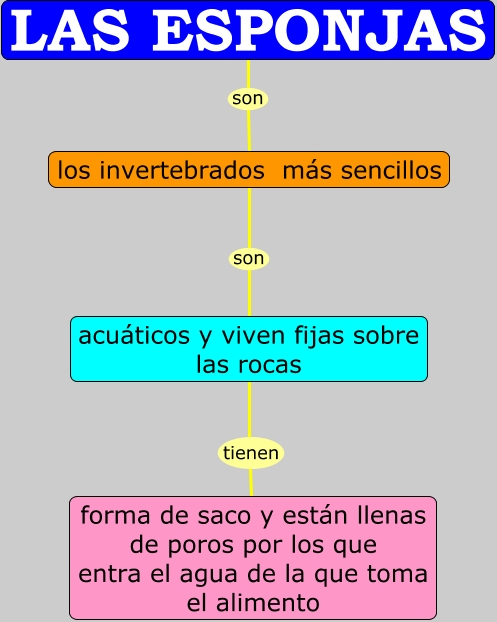 Este Cmap, tiene información relacionada con: Las esponjas, acuáticos y viven fijas sobre las rocas tienen forma de saco y están llenas de poros por los que entra el agua de la que toma el alimento, los invertebrados más sencillos son acuáticos y viven fijas sobre las rocas, LAS ESPONJAS son los invertebrados más sencillos