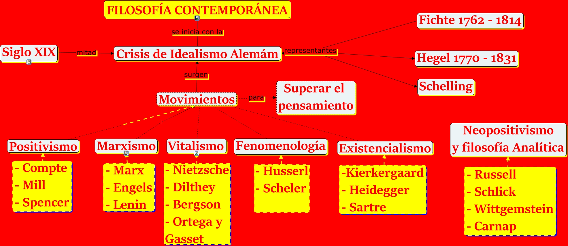 Este Cmap, tiene información relacionada con: MAPA CONCEPTUAL-JaVo, Fichte 1762 - 1814 representantes Schelling, - Russell - Schlick - Wittgemstein - Carnap ???? Neopositivismo y filosofía Analítica, Marxismo Movimientos, Positivismo ???? - Compte - Mill - Spencer, FILOSOFÍA CONTEMPORÁNEA se inicia con la Crisis de Idealismo Alemám, Movimientos para Superar el pensamiento, - Compte - Mill - Spencer ???? Positivismo, Fenomenología ???? Movimientos, - Marx - Engels - Lenin ???? Marxismo, Vitalismo ???? Movimientos, Fichte 1762 - 1814 representantes Hegel 1770 - 1831, Movimientos surgen Crisis de Idealismo Alemám, - Nietzsche - Dilthey - Bergson - Ortega y Gasset ???? Vitalismo, Fichte 1762 - 1814 representantes Crisis de Idealismo Alemám, Positivismo Movimientos, - Husserl - Scheler ???? Fenomenología, Siglo XIX mitad Crisis de Idealismo Alemám, Existencialismo ???? Movimientos, -Kierkergaard - Heidegger - Sartre ???? Existencialismo