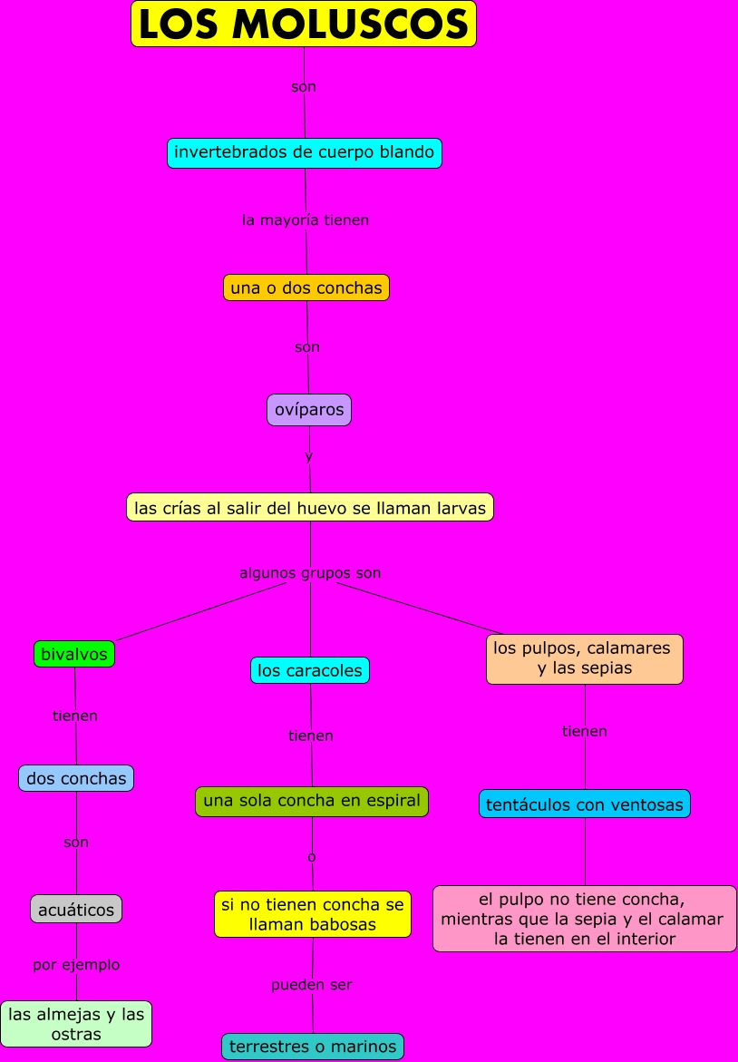 Este Cmap, tiene información relacionada con: Los moluscos, acuáticos por ejemplo las almejas y las ostras, si no tienen concha se llaman babosas pueden ser terrestres o marinos, los pulpos, calamares y las sepias tienen tentáculos con ventosas, ovíparos y las crías al salir del huevo se llaman larvas, las crías al salir del huevo se llaman larvas algunos grupos son los pulpos, calamares y las sepias, las crías al salir del huevo se llaman larvas algunos grupos son bivalvos, una o dos conchas son ovíparos, tentáculos con ventosas el pulpo no tiene concha, mientras que la sepia y el calamar la tienen en el interior, invertebrados de cuerpo blando la mayoría tienen una o dos conchas, los caracoles tienen una sola concha en espiral, una sola concha en espiral o si no tienen concha se llaman babosas, las crías al salir del huevo se llaman larvas algunos grupos son los caracoles, bivalvos tienen dos conchas, LOS MOLUSCOS son invertebrados de cuerpo blando, dos conchas son acuáticos