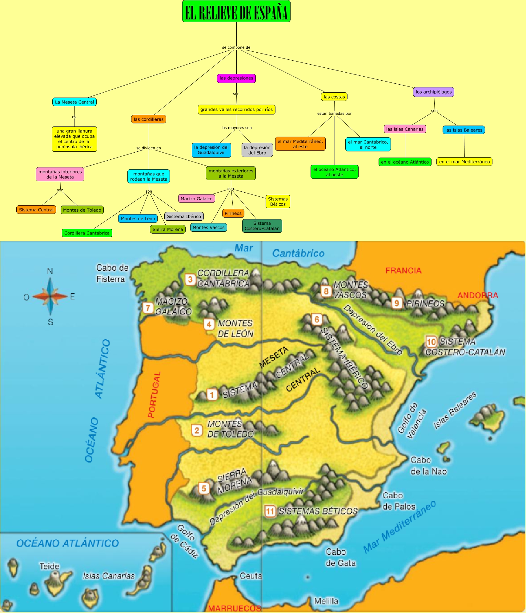 Este Cmap, tiene información relacionada con: El relieve de España, montañas interiores de la Meseta son Montes de Toledo, montañas exteriores a la Meseta son Sistemas Béticos, EL RELIEVE DE ESPAÑA se compone de las cordilleras, los archipiélagos son las islas Baleares, La Meseta Central es una gran llanura elevada que ocupa el centro de la península ibérica, los archipiélagos son las islas Canarias, las islas Baleares en el mar Mediterráneo, grandes valles recorridos por ríos las mayores son la depresión del Guadalquivir, las islas Canarias en el océano Atlántico, EL RELIEVE DE ESPAÑA se compone de las depresiones, montañas exteriores a la Meseta son Pirineos, montañas exteriores a la Meseta son Macizo Galaico, las costas están bañadas por el mar Mediterráneo, al este, grandes valles recorridos por ríos las mayores son la depresión del Ebro, las cordilleras se dividen en montañas interiores de la Meseta, EL RELIEVE DE ESPAÑA se compone de las costas, las costas están bañadas por el mar Cantábrico, al norte, EL RELIEVE DE ESPAÑA se compone de los archipiélagos, las costas están bañadas por el océano Atlántico, al oeste, montañas exteriores a la Meseta son Sistema Costero-Catalán