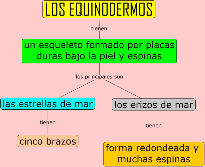 Este Cmap, tiene información relacionada con: Los equinodermos, los erizos de mar tienen forma redondeada y muchas espinas, las estrellas de mar tienen cinco brazos, un esqueleto formado por placas duras bajo la piel y espinas los principales son las estrellas de mar, un esqueleto formado por placas duras bajo la piel y espinas los principales son los erizos de mar, LOS EQUINODERMOS tienen un esqueleto formado por placas duras bajo la piel y espinas