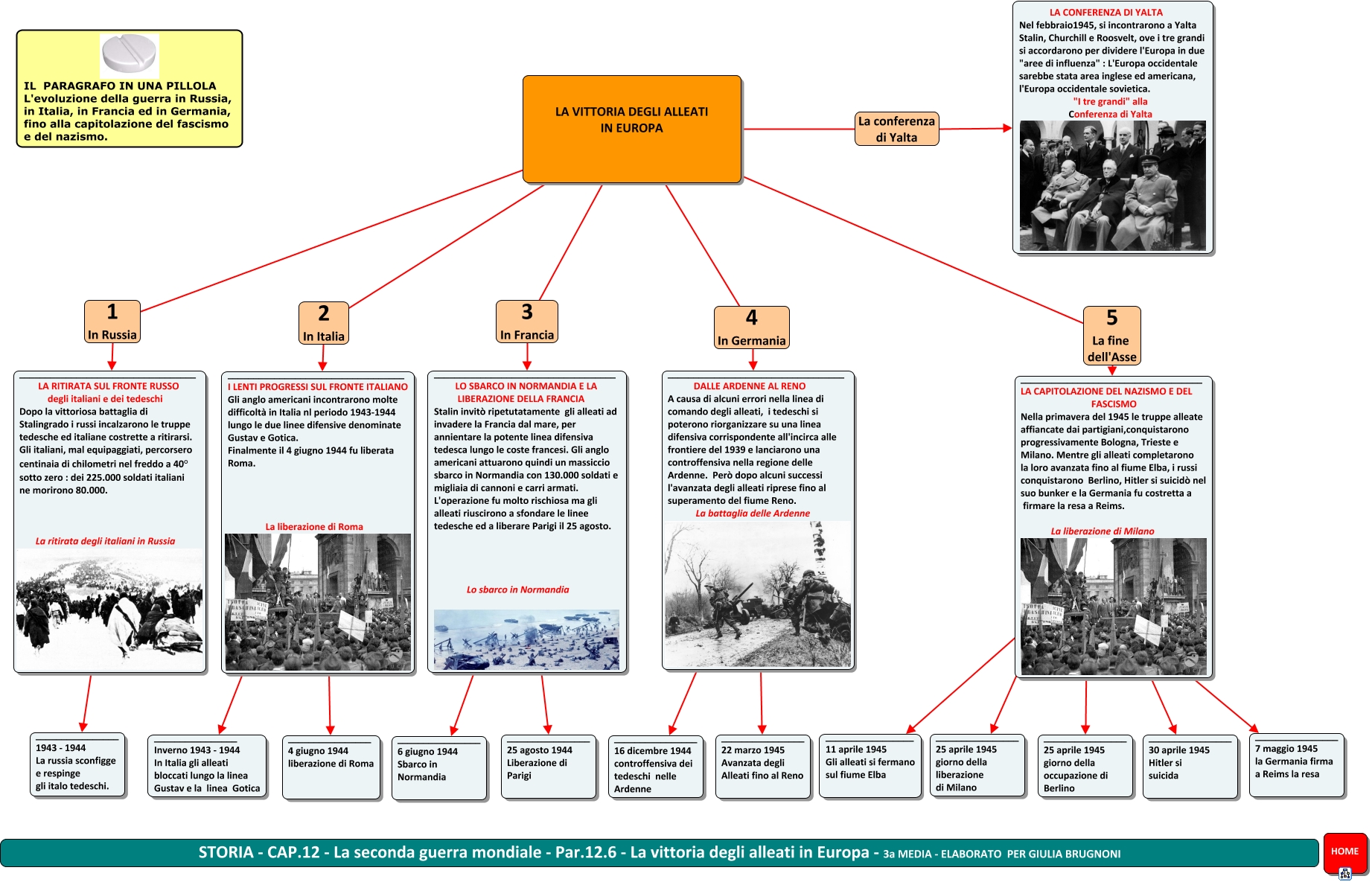 Questa Cmap, creata con IHMC CmapTools, contiene informazioni relative a: STORIA - Par.12.6 - La vittoria degli alleati in Europa - GB 3a media, LA VITTORIA DEGLI ALLEATI IN EUROPA 2 In Italia __________________________________ I LENTI PROGRESSI SUL FRONTE ITALIANO Gli anglo americani incontrarono molte difficoltà in Italia nl periodo 1943-1944 lungo le due linee difensive denominate Gustav e Gotica. Finalmente il 4 giugno 1944 fu liberata Roma. La liberazione di Roma, __________________________________ LA RITIRATA SUL FRONTE RUSSO degli italiani e dei tedeschi Dopo la vittoriosa battaglia di Stalingrado i russi incalzarono le truppe tedesche ed italiane costrette a ritirarsi. Gli italiani, mal equipaggiati, percorsero centinaia di chilometri nel freddo a 40° sotto zero : dei 225.000 soldati italiani ne morirono 80.000. La ritirata degli italiani in Russia ???? ________________ 1943 - 1944 La russia sconfigge e respinge gli italo tedeschi., LA VITTORIA DEGLI ALLEATI IN EUROPA 4 In Germania __________________________________ DALLE ARDENNE AL RENO A causa di alcuni errori nella linea di comando degli alleati, i tedeschi si poterono riorganizzare su una linea difensiva corrispondente all'incirca alle frontiere del 1939 e lanciarono una controffensiva nella regione delle Ardenne. Però dopo alcuni successi l'avanzata degli alleati riprese fino al superamento del fiume Reno. La battaglia delle Ardenne, __________________________________ DALLE ARDENNE AL RENO A causa di alcuni errori nella linea di comando degli alleati, i tedeschi si poterono riorganizzare su una linea difensiva corrispondente all'incirca alle frontiere del 1939 e lanciarono una controffensiva nella regione delle Ardenne. Però dopo alcuni successi l'avanzata degli alleati riprese fino al superamento del fiume Reno. La battaglia delle Ardenne ???? ________________ 22 marzo 1945 Avanzata degli Alleati fino al Reno, ___________________________________ LO SBARCO IN NORMANDIA E LA LIBERAZIONE DELLA FRANCIA Stalin invitò ripetutatamente gli alleati ad invadere la Francia dal mare, per annientare la potente linea difensiva tedesca lungo le coste francesi. Gli anglo americani attuarono quindi un massiccio sbarco in Normandia con 130.000 soldati e migliaia di cannoni e carri armati. L'operazione fu molto rischiosa ma gli alleati riuscirono a sfondare le linee tedesche ed a liberare Parigi il 25 agosto. Lo sbarco in Normandia ???? ________________ 6 giugno 1944 Sbarco in Normandia, LA VITTORIA DEGLI ALLEATI IN EUROPA La conferenza di Yalta LA CONFERENZA DI YALTA Nel febbraio1945, si incontrarono a Yalta Stalin, Churchill e Roosvelt, ove i tre grandi si accordarono per dividere l'Europa in due "aree di influenza" : L'Europa occidentale sarebbe stata area inglese ed americana, l'Europa occidentale sovietica. "I tre grandi" alla Conferenza di Yalta, ___________________________________ LA CAPITOLAZIONE DEL NAZISMO E DEL FASCISMO Nella primavera del 1945 le truppe alleate affiancate dai partigiani,conquistarono progressivamente Bologna, Trieste e Milano. Mentre gli alleati completarono la loro avanzata fino al fiume Elba, i russi conquistarono Berlino, Hitler si suicidò nel suo bunker e la Germania fu costretta a firmare la resa a Reims. La liberazione di Milano ???? ________________ 25 aprile 1945 giorno della liberazione di Milano, LA VITTORIA DEGLI ALLEATI IN EUROPA 1 In Russia __________________________________ LA RITIRATA SUL FRONTE RUSSO degli italiani e dei tedeschi Dopo la vittoriosa battaglia di Stalingrado i russi incalzarono le truppe tedesche ed italiane costrette a ritirarsi. Gli italiani, mal equipaggiati, percorsero centinaia di chilometri nel freddo a 40° sotto zero : dei 225.000 soldati italiani ne morirono 80.000. La ritirata degli italiani in Russia, ___________________________________ LA CAPITOLAZIONE DEL NAZISMO E DEL FASCISMO Nella primavera del 1945 le truppe alleate affiancate dai partigiani,conquistarono progressivamente Bologna, Trieste e Milano. Mentre gli alleati completarono la loro avanzata fino al fiume Elba, i russi conquistarono Berlino, Hitler si suicidò nel suo bunker e la Germania fu costretta a firmare la resa a Reims. La liberazione di Milano ???? _________________ 11 aprile 1945 Gli alleati si fermano sul fiume Elba, ___________________________________ LA CAPITOLAZIONE DEL NAZISMO E DEL FASCISMO Nella primavera del 1945 le truppe alleate affiancate dai partigiani,conquistarono progressivamente Bologna, Trieste e Milano. Mentre gli alleati completarono la loro avanzata fino al fiume Elba, i russi conquistarono Berlino, Hitler si suicidò nel suo bunker e la Germania fu costretta a firmare la resa a Reims. La liberazione di Milano ???? ________________ 25 aprile 1945 giorno della occupazione di Berlino, LA VITTORIA DEGLI ALLEATI IN EUROPA 3 In Francia ___________________________________ LO SBARCO IN NORMANDIA E LA LIBERAZIONE DELLA FRANCIA Stalin invitò ripetutatamente gli alleati ad invadere la Francia dal mare, per annientare la potente linea difensiva tedesca lungo le coste francesi. Gli anglo americani attuarono quindi un massiccio sbarco in Normandia con 130.000 soldati e migliaia di cannoni e carri armati. L'operazione fu molto rischiosa ma gli alleati riuscirono a sfondare le linee tedesche ed a liberare Parigi il 25 agosto. Lo sbarco in Normandia, __________________________________ DALLE ARDENNE AL RENO A causa di alcuni errori nella linea di comando degli alleati, i tedeschi si poterono riorganizzare su una linea difensiva corrispondente all'incirca alle frontiere del 1939 e lanciarono una controffensiva nella regione delle Ardenne. Però dopo alcuni successi l'avanzata degli alleati riprese fino al superamento del fiume Reno. La battaglia delle Ardenne ???? ________________ 16 dicembre 1944 controffensiva dei tedeschi nelle Ardenne, __________________________________ I LENTI PROGRESSI SUL FRONTE ITALIANO Gli anglo americani incontrarono molte difficoltà in Italia nl periodo 1943-1944 l