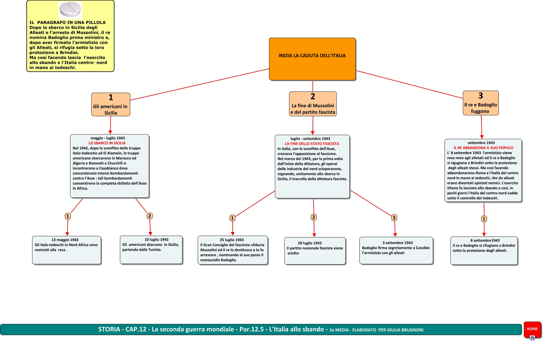 Questa Cmap, creata con IHMC CmapTools, contiene informazioni relative a: STORIA - Par.12.5 - L'Italia allo sbando - GB 3a media, settembre 1943 IL RE ABBANDONA IL SUO POPOLO L' 8 settembre 1943 l'armistizio viene reso noto agli alletati ed il re e Badoglio si rigugiano a Brindisi sotto la protezione degli alleati stessi. Ma così facendo abbandonarono Roma e l'Italia del centro nord in mano ai tedeschi, che da alleati erano diventati spietati nemici. L'esercito itliano fu lasciato allo sbando e così, in pochi giorni l'Italia del centro-nord cadde sotto il controllo dei tedeschi. 1 8 settembre1943 Il re e Badoglio si rifugiano a Brindisi sotto la protezione degli alleati., INIZIA LA CADUTA DELL'ITALIA 2 La fine di Mussolini e del partito fascista luglio - settembre 1943 LA FINE DELLO STATO FASCISTA In italia, con le sconfitte dell'Asse, cresceva l'opposizione al fascismo. Nel marzo del 1943, per la prima volta dall'inizio della dittatura, gli operai delle industrie del nord scioperarono, segnando, unitamente allo sbarco in Sicilia, il tracrollo della dittatura fascista., luglio - settembre 1943 LA FINE DELLO STATO FASCISTA In italia, con le sconfitte dell'Asse, cresceva l'opposizione al fascismo. Nel marzo del 1943, per la prima volta dall'inizio della dittatura, gli operai delle industrie del nord scioperarono, segnando, unitamente allo sbarco in Sicilia, il tracrollo della dittatura fascista. 1 25 luglio 1943 Il Gran Consiglio del fascismo sfiducia Mussolini ed il re lo destitusce e lo fa arrestare , nominando al suo posto il maresciallo Badoglio., INIZIA LA CADUTA DELL'ITALIA 3 Il re e Badoglio fuggono settembre 1943 IL RE ABBANDONA IL SUO POPOLO L' 8 settembre 1943 l'armistizio viene reso noto agli alletati ed il re e Badoglio si rigugiano a Brindisi sotto la protezione degli alleati stessi. Ma così facendo abbandonarono Roma e l'Italia del centro nord in mano ai tedeschi, che da alleati erano diventati spietati nemici. L'esercito itliano fu lasciato allo sbando e così, in pochi giorni l'Italia del centro-nord cadde sotto il controllo dei tedeschi., luglio - settembre 1943 LA FINE DELLO STATO FASCISTA In italia, con le sconfitte dell'Asse, cresceva l'opposizione al fascismo. Nel marzo del 1943, per la prima volta dall'inizio della dittatura, gli operai delle industrie del nord scioperarono, segnando, unitamente allo sbarco in Sicilia, il tracrollo della dittatura fascista. 3 3 settembre 1943 Badoglio firma segretamente a Cassible l'armistizio con gli alleati, maggio - luglio 1943 LO SBARCO IN SICILIA Nel 1942, dopo la sconfitta delle truppe italo-tedesche ad El Alamein, le truppe americane sbarcarono in Marocco ed Algeria e Roosvelt e Churchill si incontrarono a Casablanca dove concordarono intensi bombardamenti contro l'Asse : tali bombardamenti consentirono la completa disfatta dell'Asse in Africa. 2 10 luglio 1943 Gli americani sbarcano in Sicilia, partendo dalla Tunisia., maggio - luglio 1943 LO SBARCO IN SICILIA Nel 1942, dopo la sconfitta delle truppe italo-tedesche ad El Alamein, le truppe americane sbarcarono in Marocco ed Algeria e Roosvelt e Churchill si incontrarono a Casablanca dove concordarono intensi bombardamenti contro l'Asse : tali bombardamenti consentirono la completa disfatta dell'Asse in Africa. 1 13 maggio 1943 Gli italo-tedeschi in Nord Africa sono costretti alla resa ., luglio - settembre 1943 LA FINE DELLO STATO FASCISTA In italia, con le sconfitte dell'Asse, cresceva l'opposizione al fascismo. Nel marzo del 1943, per la prima volta dall'inizio della dittatura, gli operai delle industrie del nord scioperarono, segnando, unitamente allo sbarco in Sicilia, il tracrollo della dittatura fascista. 2 28 luglio 1943 Il partito nazionale fascista viene sciolto, INIZIA LA CADUTA DELL'ITALIA 1 Gli americani in Sicilia maggio - luglio 1943 LO SBARCO IN SICILIA Nel 1942, dopo la sconfitta delle truppe italo-tedesche ad El Alamein, le truppe americane sbarcarono in Marocco ed Algeria e Roosvelt e Churchill si incontrarono a Casablanca dove concordarono intensi bombardamenti contro l'Asse : tali bombardamenti consentirono la completa disfatta dell'Asse in Africa.