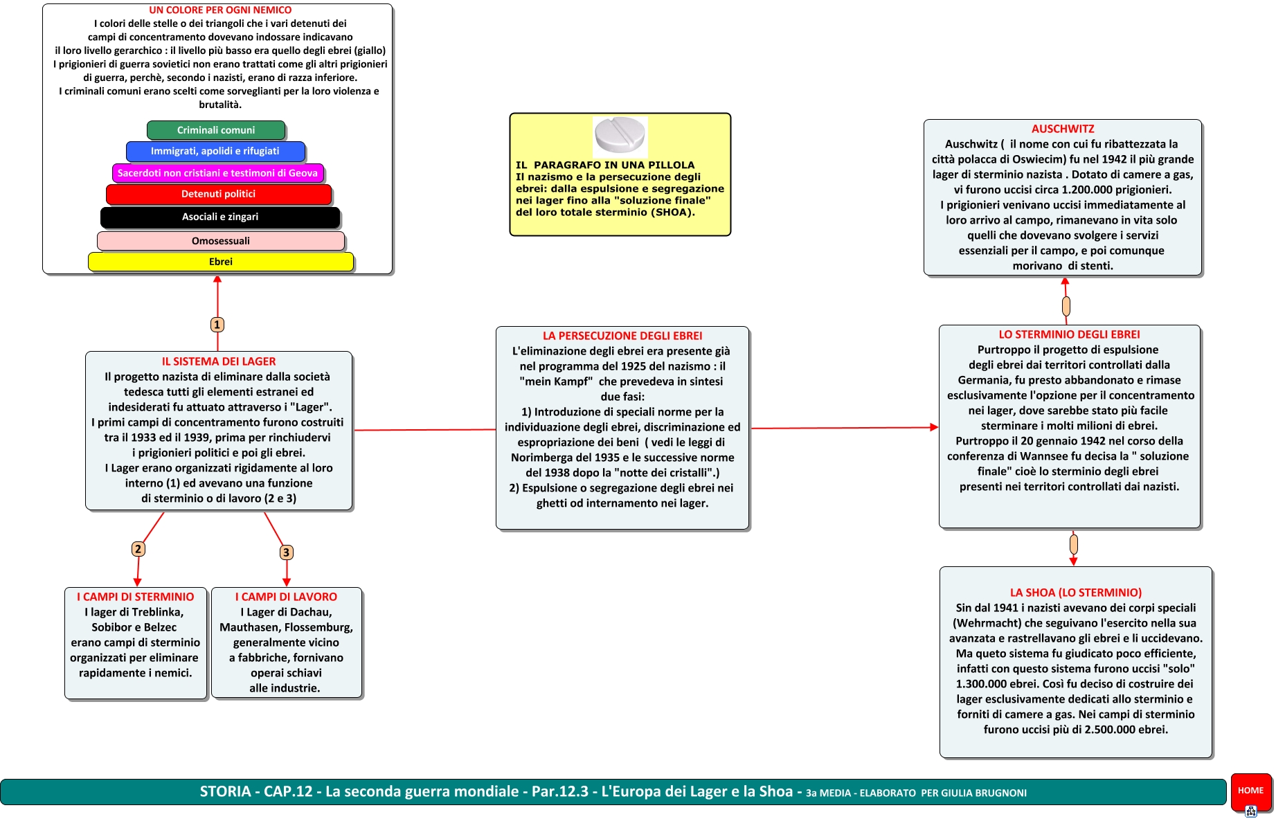 Questa Cmap, creata con IHMC CmapTools, contiene informazioni relative a: STORIA - Par.12.3 - L'Europa dei lager e la Shoa - GB 3a media, IL SISTEMA DEI LAGER Il progetto nazista di eliminare dalla società tedesca tutti gli elementi estranei ed indesiderati fu attuato attraverso i "Lager". I primi campi di concentramento furono costruiti tra il 1933 ed il 1939, prima per rinchiudervi i prigionieri politici e poi gli ebrei. I Lager erano organizzati rigidamente al loro interno (1) ed avevano una funzione di sterminio o di lavoro (2 e 3) 1, IL SISTEMA DEI LAGER Il progetto nazista di eliminare dalla società tedesca tutti gli elementi estranei ed indesiderati fu attuato attraverso i "Lager". I primi campi di concentramento furono costruiti tra il 1933 ed il 1939, prima per rinchiudervi i prigionieri politici e poi gli ebrei. I Lager erano organizzati rigidamente al loro interno (1) ed avevano una funzione di sterminio o di lavoro (2 e 3) 2 I CAMPI DI STERMINIO I lager di Treblinka, Sobibor e Belzec erano campi di sterminio organizzati per eliminare rapidamente i nemici., LO STERMINIO DEGLI EBREI Purtroppo il progetto di espulsione degli ebrei dai territori controllati dalla Germania, fu presto abbandonato e rimase esclusivamente l'opzione per il concentramento nei lager, dove sarebbe stato più facile sterminare i molti milioni di ebrei. Purtroppo il 20 gennaio 1942 nel corso della conferenza di Wannsee fu decisa la " soluzione finale" cioè lo sterminio degli ebrei presenti nei territori controllati dai nazisti. AUSCHWITZ Auschwitz ( il nome con cui fu ribattezzata la città polacca di Oswiecim) fu nel 1942 il più grande lager di sterminio nazista . Dotato di camere a gas, vi furono uccisi circa 1.200.000 prigionieri. I prigionieri venivano uccisi immediatamente al loro arrivo al campo, rimanevano in vita solo quelli che dovevano svolgere i servizi essenziali per il campo, e poi comunque morivano di stenti., LO STERMINIO DEGLI EBREI Purtroppo il progetto di espulsione degli ebrei dai territori controllati dalla Germania, fu presto abbandonato e rimase esclusivamente l'opzione per il concentramento nei lager, dove sarebbe stato più facile sterminare i molti milioni di ebrei. Purtroppo il 20 gennaio 1942 nel corso della conferenza di Wannsee fu decisa la " soluzione finale" cioè lo sterminio degli ebrei presenti nei territori controllati dai nazisti. LA SHOA (LO STERMINIO) Sin dal 1941 i nazisti avevano dei corpi speciali (Wehrmacht) che seguivano l'esercito nella sua avanzata e rastrellavano gli ebrei e li uccidevano. Ma queto sistema fu giudicato poco efficiente, infatti con questo sistema furono uccisi "solo" 1.300.000 ebrei. Così fu deciso di costruire dei lager esclusivamente dedicati allo sterminio e forniti di camere a gas. Nei campi di sterminio furono uccisi più di 2.500.000 ebrei., IL SISTEMA DEI LAGER Il progetto nazista di eliminare dalla società tedesca tutti gli elementi estranei ed indesiderati fu attuato attraverso i "Lager". I primi campi di concentramento furono costruiti tra il 1933 ed il 1939, prima per rinchiudervi i prigionieri politici e poi gli ebrei. I Lager erano organizzati rigidamente al loro interno (1) ed avevano una funzione di sterminio o di lavoro (2 e 3) 3 I CAMPI DI LAVORO I Lager di Dachau, Mauthasen, Flossemburg, generalmente vicino a fabbriche, fornivano operai schiavi alle industrie., IL SISTEMA DEI LAGER Il progetto nazista di eliminare dalla società tedesca tutti gli elementi estranei ed indesiderati fu attuato attraverso i "Lager". I primi campi di concentramento furono costruiti tra il 1933 ed il 1939, prima per rinchiudervi i prigionieri politici e poi gli ebrei. I Lager erano organizzati rigidamente al loro interno (1) ed avevano una funzione di sterminio o di lavoro (2 e 3) ???? LO STERMINIO DEGLI EBREI Purtroppo il progetto di espulsione degli ebrei dai territori controllati dalla Germania, fu presto abbandonato e rimase esclusivamente l'opzione per il concentramento nei lager, dove sarebbe stato più facile sterminare i molti milioni di ebrei. Purtroppo il 20 gennaio 1942 nel corso della conferenza di Wannsee fu decisa la " soluzione finale" cioè lo sterminio degli ebrei presenti nei territori controllati dai nazisti.
