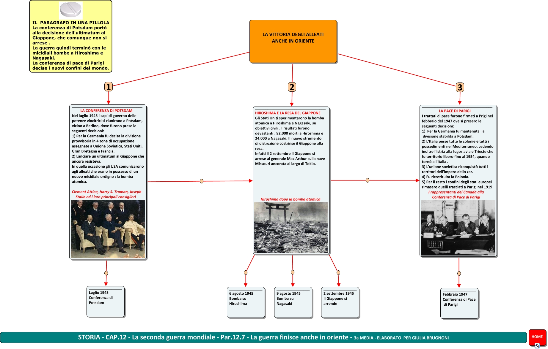 Questa Cmap, creata con IHMC CmapTools, contiene informazioni relative a: STORIA - Par.12.7 - La guerra finisce anche in oriente - GB 3a media, __________________________________ HIROSHIMA E LA RESA DEL GIAPPONE Gli Stati Uniti sperimentarono la bomba atomica a Hiroshima e Nagasaki, su obiettivi civili . I risultati furono devastanti : 92.000 morti a Hiroshima e 24.000 a Nagasaki. Il nuovo strumento di distruzione costrinse il Giappone alla resa. Infatti il 2 settembre il Giappone si arrese al generale Mac Arthur sulla nave Missouri ancorata al largo di Tokio. Hiroshima dopo la bomba atomica ________________ 2 settembre 1945 Il Giappone si arrende, __________________________________ LA CONFERENZA DI POTSDAM Nel luglio 1945 i capi di governo delle potenze vincitrici si riunirono a Potsdam, vicino a Berlino, dove furono prese le seguenti decisioni: 1) Per la Germania fu decisa la divisione provvisoria in 4 zone di occupazione assegnate a Unione Sovietica, Stati Uniti, Gran Bretagna e Francia. 2) Lanciare un ultimatum al Giappone che ancora resisteva. In quella occasione gli USA comunicarono agli alleati che erano in possesso di un nuovo micidiale ordigno : la bomba atomica. Clement Attlee, Harry S. Truman, Joseph Stalin ed i loro principali consiglieri __________________________________ HIROSHIMA E LA RESA DEL GIAPPONE Gli Stati Uniti sperimentarono la bomba atomica a Hiroshima e Nagasaki, su obiettivi civili . I risultati furono devastanti : 92.000 morti a Hiroshima e 24.000 a Nagasaki. Il nuovo strumento di distruzione costrinse il Giappone alla resa. Infatti il 2 settembre il Giappone si arrese al generale Mac Arthur sulla nave Missouri ancorata al largo di Tokio. Hiroshima dopo la bomba atomica, LA VITTORIA DEGLI ALLEATI ANCHE IN ORIENTE 1 __________________________________ LA CONFERENZA DI POTSDAM Nel luglio 1945 i capi di governo delle potenze vincitrici si riunirono a Potsdam, vicino a Berlino, dove furono prese le seguenti decisioni: 1) Per la Germania fu decisa la divisione provvisoria in 4 zone di occupazione assegnate a Unione Sovietica, Stati Uniti, Gran Bretagna e Francia. 2) Lanciare un ultimatum al Giappone che ancora resisteva. In quella occasione gli USA comunicarono agli alleati che erano in possesso di un nuovo micidiale ordigno : la bomba atomica. Clement Attlee, Harry S. Truman, Joseph Stalin ed i loro principali consiglieri, __________________________________ HIROSHIMA E LA RESA DEL GIAPPONE Gli Stati Uniti sperimentarono la bomba atomica a Hiroshima e Nagasaki, su obiettivi civili . I risultati furono devastanti : 92.000 morti a Hiroshima e 24.000 a Nagasaki. Il nuovo strumento di distruzione costrinse il Giappone alla resa. Infatti il 2 settembre il Giappone si arrese al generale Mac Arthur sulla nave Missouri ancorata al largo di Tokio. Hiroshima dopo la bomba atomica ________________ 6 agosto 1945 Bomba su Hiroshima, __________________________________ HIROSHIMA E LA RESA DEL GIAPPONE Gli Stati Uniti sperimentarono la bomba atomica a Hiroshima e Nagasaki, su obiettivi civili . I risultati furono devastanti : 92.000 morti a Hiroshima e 24.000 a Nagasaki. Il nuovo strumento di distruzione costrinse il Giappone alla resa. Infatti il 2 settembre il Giappone si arrese al generale Mac Arthur sulla nave Missouri ancorata al largo di Tokio. Hiroshima dopo la bomba atomica ________________ 9 agosto 1945 Bomba su Nagasaki, __________________________________ LA PACE DI PARIGI I trattati di pace furono firmati a Prigi nel febbraio del 1947 ove si presero le seguenti decisioni: 1) Per la Germania fu mantenuta la divisione stabilita a Potsdam. 2) L'Italia perse tutte le colonie e tutti i possedimenti nel Mediterraneo, cedendo inoltre l'Istria alla Iugoslavia e Trieste che fu territorio libero fino al 1954, quando tornò all'Italia . 3) L'unione sovietica riconquistò tutti i territori dell'impero dello zar. 4) Fu ricostituita la Polonia. 5) Per il resto i confini degli stati europei rimasero quelli tracciati a Parigi nel 1919 I rappresentanti del Canada alla Conferenza di Pace di Parigi ________________ Febbraio 1947 Conferenza di Pace di Parigi, LA VITTORIA DEGLI ALLEATI ANCHE IN ORIENTE 2 __________________________________ HIROSHIMA E LA RESA DEL GIAPPONE Gli Stati Uniti sperimentarono la bomba atomica a Hiroshima e Nagasaki, su obiettivi civili . I risultati furono devastanti : 92.000 morti a Hiroshima e 24.000 a Nagasaki. Il nuovo strumento di distruzione costrinse il Giappone alla resa. Infatti il 2 settembre il Giappone si arrese al generale Mac Arthur sulla nave Missouri ancorata al largo di Tokio. Hiroshima dopo la bomba atomica, __________________________________ LA CONFERENZA DI POTSDAM Nel luglio 1945 i capi di governo delle potenze vincitrici si riunirono a Potsdam, vicino a Berlino, dove furono prese le seguenti decisioni: 1) Per la Germania fu decisa la divisione provvisoria in 4 zone di occupazione assegnate a Unione Sovietica, Stati Uniti, Gran Bretagna e Francia. 2) Lanciare un ultimatum al Giappone che ancora resisteva. In quella occasione gli USA comunicarono agli alleati che erano in possesso di un nuovo micidiale ordigno : la bomba atomica. Clement Attlee, Harry S. Truman, Joseph Stalin ed i loro principali consiglieri ________________ Luglio 1945 Conferenza di Potsdam, LA VITTORIA DEGLI ALLEATI ANCHE IN ORIENTE 3 __________________________________ LA PACE DI PARIGI I trattati di pace furono firmati a Prigi nel febbraio del 1947 ove si presero le seguenti decisioni: 1) Per la Germania fu mantenuta la divisione stabilita a Potsdam. 2) L'Italia perse tutte le colonie e tutti i possedimenti nel Mediterraneo, cedendo inoltre l'Istria alla Iugoslavia e Trieste che fu territorio libero fino al 1954, quando tornò all'Italia . 3) L'unione sovietica riconquistò tutti i territori dell'impero dello zar. 4) Fu ricostituita la Polonia. 5) Per il resto i confini degli stati europei rimasero quelli tracciati a Parigi nel 1919 I rappresentanti del Canada alla Conferenza d