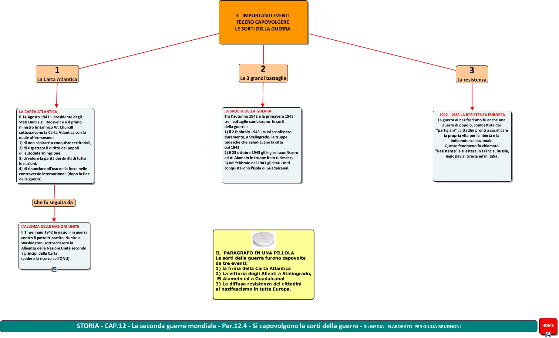 Questa Cmap, creata con IHMC CmapTools, contiene informazioni relative a: STORIA - Par.12.4 - Si capovolgono le sorti della guerra - GB 3a media, 3 IMPORTANTI EVENTI FECERO CAPOVOLGERE LE SORTI DELLA GUERRA 1 La Carta Atlantica LA CARTA ATLANTICA Il 14 Agosto 1941 il presidente degli Stati Uniti F.D. Roosvelt e e il primo ministro britannico W. Churcill sottoscrivono la Carta Atlantica con la quale affermavano: 1) di non aspirare a conquiste territoriali, 2) di rispettare il diritto dei popoli di autodeterminazione, 3) di volere la parità dei diritti di tutte le nazioni, 4) di rinunciare all'uso della forza nelle controversie internazionali (dopo la fine della guerra)., 3 IMPORTANTI EVENTI FECERO CAPOVOLGERE LE SORTI DELLA GUERRA 3 La resistenza 1942 - 1943 LA RESISTENZA EUROPEA La guerra al nazifascismo fu anche una guerra di popolo, combattuta dai "partigiani" , cittadini pronti a sacrificare la propria vita per la libertà e la indipendenza nazionale. Questo fenomeno fu chiamato "Resistenza" e si estese in Francia, Russia, Iugloslavia, Grecia ed in Italia ., 3 IMPORTANTI EVENTI FECERO CAPOVOLGERE LE SORTI DELLA GUERRA 2 Le 3 grandi battaglie LA SVOLTA DELLA GUERRA Tra l'autunno 1942 e la primavera 1943 tre battaglie cambiarono le sorti della guerra : 1) il 2 febbraio 1943 I russi sconfissero duramente, a Stalingrado, le truppe tedesche che assediavano la città dal 1942, 2) il 23 ottobre 1943 gli inglesi sconfissero ad Al Alamein le truppe italo tedesche, 3) nel febbraio del 1943 gli Stati Uniti conquistarono l'isola di Guadalcanal., LA CARTA ATLANTICA Il 14 Agosto 1941 il presidente degli Stati Uniti F.D. Roosvelt e e il primo ministro britannico W. Churcill sottoscrivono la Carta Atlantica con la quale affermavano: 1) di non aspirare a conquiste territoriali, 2) di rispettare il diritto dei popoli di autodeterminazione, 3) di volere la parità dei diritti di tutte le nazioni, 4) di rinunciare all'uso della forza nelle controversie internazionali (dopo la fine della guerra). Che fu seguita da L'ALLENZA DELLE NAZIONI UNITE Il 1° gennaio 1942 le nazioni in guerra contro il patto tripartito, riunite a Washington, sottoscrissero la Alleanza delle Nazioni Unite secondo i principi della Carta. (vedere la ricerca sull'ONU)