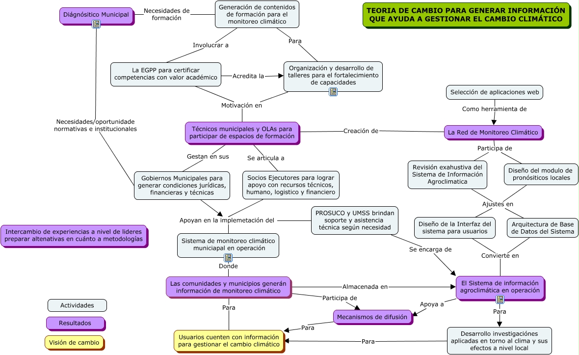 Este Cmap, tiene información relacionada con: TdC Sistema de Monitoreo Climático, Generación de contenidos de formación para el monitoreo climático Involucrar a La EGPP para certificar competencias con valor académico, Las comunidades y municipios generán información de monitoreo climático Para Usuarios cuenten con información para gestionar el cambio climático, Socios Ejecutores para lograr apoyo con recursos técnicos, humano, logistico y financiero Apoyan en la implemetación del Sistema de monitoreo climático municiapal en operación, Las comunidades y municipios generán información de monitoreo climático Participa de Mecanismos de difusión, PROSUCO y UMSS brindan soporte y asistencia técnica según necesidad Apoyan en la implemetación del Sistema de monitoreo climático municiapal en operación, Organización y desarrollo de talleres para el fortalecimiento de capacidades Motivación en Técnicos municipales y OLAs para participar de espacios de formación, Selección de aplicaciones web Como herramienta de La Red de Monitoreo Climático, Diágnósitico Municipal Necesidades/oportunidade normativas e institucionales Gobiernos Municipales para generar condiciones jurídicas, financieras y técnicas, Diseño del modulo de pronósiticos locales Ajustes en Diseño de la Interfaz del sistema para usuarios, Técnicos municipales y OLAs para participar de espacios de formación Se articula a Socios Ejecutores para lograr apoyo con recursos técnicos, humano, logistico y financiero, PROSUCO y UMSS brindan soporte y asistencia técnica según necesidad Se encarga de El Sistema de información agroclimática en operación, La EGPP para certificar competencias con valor académico Motivación en Técnicos municipales y OLAs para participar de espacios de formación, El Sistema de información agroclimática en operación Apoya a Mecanismos de difusión, Mecanismos de difusión Para Usuarios cuenten con información para gestionar el cambio climático, La Red de Monitoreo Climático Participa de Revisión exahustiva del Sistema de Información Agroclimatica, Arquitectura de Base de Datos del Sistema Convierte en El Sistema de información agroclimática en operación, La Red de Monitoreo Climático Participa de Diseño del modulo de pronósiticos locales, Diseño de la Interfaz del sistema para usuarios Convierte en El Sistema de información agroclimática en operación, Técnicos municipales y OLAs para participar de espacios de formación Creación de La Red de Monitoreo Climático, Revisión exahustiva del Sistema de Información Agroclimatica Ajustes en Arquitectura de Base de Datos del Sistema
