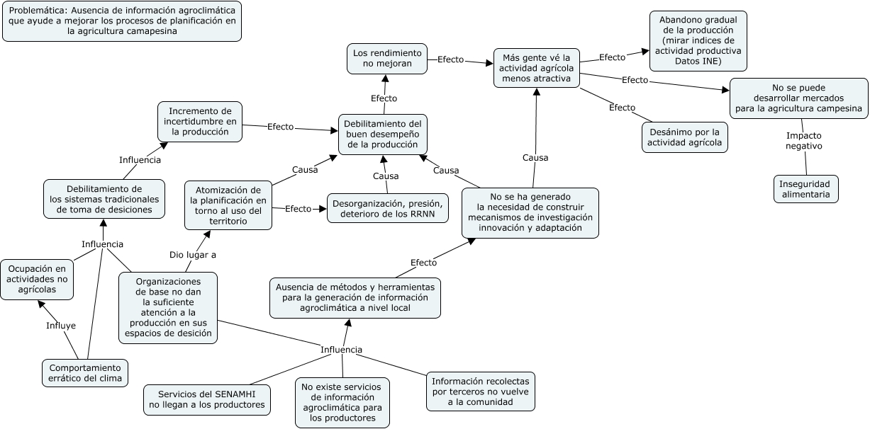 Este Cmap, tiene información relacionada con: planificación_agricultura_campesina, Atomización de la planificación en torno al uso del territorio Efecto Desorganización, presión, deterioro de los RRNN, Más gente vé la actividad agrícola menos atractiva Efecto Abandono gradual de la producción (mirar indices de actividad productiva Datos INE), No existe servicios de información agroclimática para los productores Influencia Ausencia de métodos y herramientas para la generación de información agroclimática a nivel local, Desorganización, presión, deterioro de los RRNN Causa Debilitamiento del buen desempeño de la producción, Organizaciones de base no dan la suficiente atención a la producción en sus espacios de desición Influencia Debilitamiento de los sistemas tradicionales de toma de desiciones, Organizaciones de base no dan la suficiente atención a la producción en sus espacios de desición Influencia Ausencia de métodos y herramientas para la generación de información agroclimática a nivel local, No se ha generado la necesidad de construir mecanismos de investigación innovación y adaptación Causa Más gente vé la actividad agrícola menos atractiva, No se ha generado la necesidad de construir mecanismos de investigación innovación y adaptación Causa Debilitamiento del buen desempeño de la producción, Servicios del SENAMHI no llegan a los productores Influencia Ausencia de métodos y herramientas para la generación de información agroclimática a nivel local, Ausencia de métodos y herramientas para la generación de información agroclimática a nivel local Efecto No se ha generado la necesidad de construir mecanismos de investigación innovación y adaptación, Atomización de la planificación en torno al uso del territorio Causa Debilitamiento del buen desempeño de la producción, No se puede desarrollar mercados para la agricultura campesina Impacto negativo Inseguridad alimentaria, Incremento de incertidumbre en la producción Efecto Debilitamiento del buen desempeño de la producción, Comportamiento errático del clima Influencia Debilitamiento de los sistemas tradicionales de toma de desiciones, Más gente vé la actividad agrícola menos atractiva Efecto Desánimo por la actividad agrícola, Organizaciones de base no dan la suficiente atención a la producción en sus espacios de desición Dio lugar a Atomización de la planificación en torno al uso del territorio, Información recolectas por terceros no vuelve a la comunidad Influencia Ausencia de métodos y herramientas para la generación de información agroclimática a nivel local, Los rendimiento no mejoran Efecto Más gente vé la actividad agrícola menos atractiva, Comportamiento errático del clima Influye Ocupación en actividades no agrícolas, Debilitamiento de los sistemas tradicionales de toma de desiciones Influencia Incremento de incertidumbre en la producción
