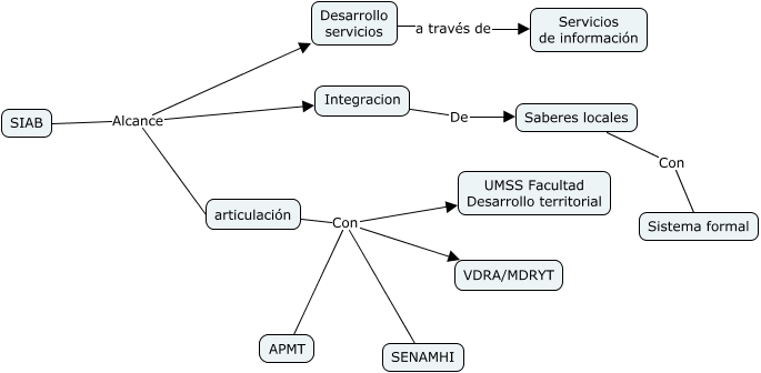 Este Cmap, tiene información relacionada con: Alcance SIAG, SIAB Alcance articulación, articulación Con SENAMHI, articulación Con VDRA/MDRYT, Integracion De Saberes locales, SIAB Alcance Desarrollo servicios, articulación Con APMT, SIAB Alcance Integracion, Saberes locales Con Sistema formal, Desarrollo servicios a través de Servicios de información, articulación Con UMSS Facultad Desarrollo territorial