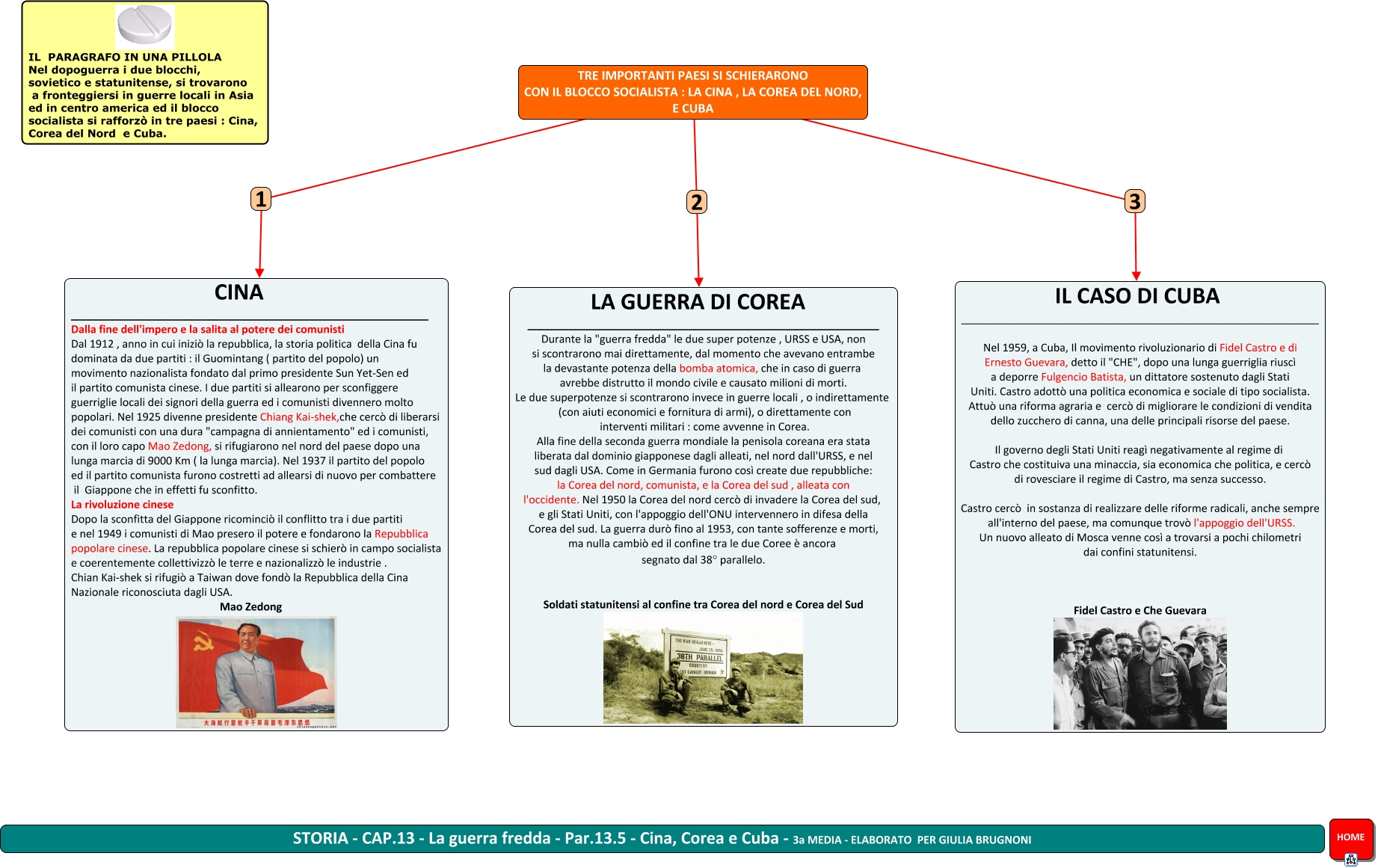 Questa Cmap, creata con IHMC CmapTools, contiene informazioni relative a: STORIA - Par.13.5 - Cina, Corea e Cuba - GB 3a media, TRE IMPORTANTI PAESI SI SCHIERARONO CON IL BLOCCO SOCIALISTA : LA CINA , LA COREA DEL NORD, E CUBA 1 CINA ____________________________________________________________ Dalla fine dell'impero e la salita al potere dei comunisti Dal 1912 , anno in cui iniziò la repubblica, la storia politica della Cina fu dominata da due partiti : il Guomintang ( partito del popolo) un movimento nazionalista fondato dal primo presidente Sun Yet-Sen ed il partito comunista cinese. I due partiti si allearono per sconfiggere guerriglie locali dei signori della guerra ed i comunisti divennero molto popolari. Nel 1925 divenne presidente Chiang Kai-shek,che cercò di liberarsi dei comunisti con una dura "campagna di annientamento" ed i comunisti, con il loro capo Mao Zedong, si rifugiarono nel nord del paese dopo una lunga marcia di 9000 Km ( la lunga marcia). Nel 1937 il partito del popolo ed il partito comunista furono costretti ad allearsi di nuovo per combattere il Giappone che in effetti fu sconfitto. La rivoluzione cinese Dopo la sconfitta del Giappone ricominciò il conflitto tra i due partiti e nel 1949 i comunisti di Mao presero il potere e fondarono la Repubblica popolare cinese. La repubblica popolare cinese si schierò in campo socialista e coerentemente collettivizzò le terre e nazionalizzò le industrie . Chian Kai-shek si rifugiò a Taiwan dove fondò la Repubblica della Cina Nazionale riconosciuta dagli USA. Mao Zedong, TRE IMPORTANTI PAESI SI SCHIERARONO CON IL BLOCCO SOCIALISTA : LA CINA , LA COREA DEL NORD, E CUBA 2 LA GUERRA DI COREA ___________________________________________________________ Durante la "guerra fredda" le due super potenze , URSS e USA, non si scontrarono mai direttamente, dal momento che avevano entrambe la devastante potenza della bomba atomica, che in caso di guerra avrebbe distrutto il mondo civile e causato milioni di morti. Le due superpotenze si scontrarono invece in guerre locali , o indirettamente (con aiuti economici e fornitura di armi), o direttamente con interventi militari : come avvenne in Corea. Alla fine della seconda guerra mondiale la penisola coreana era stata liberata dal dominio giapponese dagli alleati, nel nord dall'URSS, e nel sud dagli USA. Come in Germania furono così create due repubbliche: la Corea del nord, comunista, e la Corea del sud , alleata con l'occidente. Nel 1950 la Corea del nord cercò di invadere la Corea del sud, e gli Stati Uniti, con l'appoggio dell'ONU intervennero in difesa della Corea del sud. La guerra durò fino al 1953, con tante sofferenze e morti, ma nulla cambiò ed il confine tra le due Coree è ancora segnato dal 38° parallelo. Soldati statunitensi al confine tra Corea del nord e Corea del Sud, TRE IMPORTANTI PAESI SI SCHIERARONO CON IL BLOCCO SOCIALISTA : LA CINA , LA COREA DEL NORD, E CUBA 3 IL CASO DI CUBA ____________________________________________________________ Nel 1959, a Cuba, Il movimento rivoluzionario di Fidel Castro e di Ernesto Guevara, detto il "CHE", dopo una lunga guerriglia riuscì a deporre Fulgencio Batista, un dittatore sostenuto dagli Stati Uniti. Castro adottò una politica economica e sociale di tipo socialista. Attuò una riforma agraria e cercò di migliorare le condizioni di vendita dello zucchero di canna, una delle principali risorse del paese. Il governo degli Stati Uniti reagì negativamente al regime di Castro che costituiva una minaccia, sia economica che politica, e cercò di rovesciare il regime di Castro, ma senza successo. Castro cercò in sostanza di realizzare delle riforme radicali, anche sempre all'interno del paese, ma comunque trovò l'appoggio dell'URSS. Un nuovo alleato di Mosca venne così a trovarsi a pochi chilometri dai confini statunitensi. Fidel Castro e Che Guevara