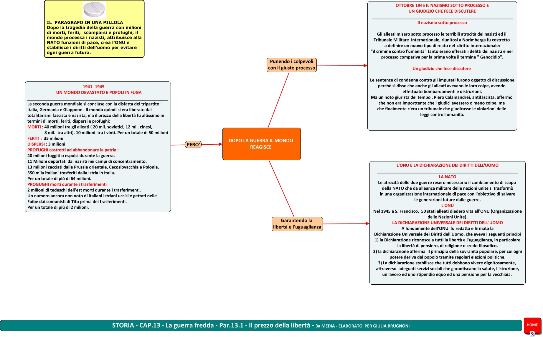 Questa Cmap, creata con IHMC CmapTools, contiene informazioni relative a: STORIA - Par.13.1 - Il prezzo della libertà - GB 3a media, 1941- 1945 UN MONDO DEVASTATO E POPOLI IN FUGA ____________________________________________________________ La seconda guerra mondiale si concluse con la disfatta del tripartito: Italia, Germania e Giappone . Il mondo quindi si era liberato dai totalitarismi fascista e nazista, ma il prezzo della libertà fu altissimo in termini di morti, feriti, dispersi e profughi: MORTI : 40 milioni tra gli alleati ( 20 mil. sovietici, 12 mil. cinesi, 8 mil. tra altri). 10 milioni tra i vinti. Per un totale di 50 milioni FERITI : 35 milioni DISPERSI : 3 milioni PROFUGHI costretti ad abbandonare la patria : 40 milioni fuggiti o espulsi durante la guerra. 11 Milioni deportati dai nazisti nei campi di concentramento. 13 milioni cacciati dalla Prussia orientale, Cecoslovacchia e Polonia. 350 mila italiani trasferiti dalla Istria in Italia. Per un totale di più di 64 milioni. PROGUGHI morti durante i trasferimenti 2 milioni di tedeschi dell’est morti durante i trasferimenti. Un numero ancora non noto di italiani Istriani uccisi e gettati nelle Foibe dai comunisti di Tito prima dei trasferimenti. Per un totale di più di 2 milioni. PERO' DOPO LA GUERRA IL MONDO REAGISCE, DOPO LA GUERRA IL MONDO REAGISCE Punendo i colpevoli con il giusto processo OTTOBRE 1945 IL NAZISMO SOTTO PROCESSO E UN GIUDIZIO CHE FECE DISCUTERE ____________________________________________________________ Il nazismo sotto processo Gli alleati misero sotto processo le terribili atrocità dei nazisti ed il Tribunale Militare Internazionale, riunitosi a Norimberga fu costretto a definire un nuovo tipo di reato nel diritto internazionale: "il crimine contro l'umanità" tanto erano efferati i delitti dei nazisti e nel processo compariva per la prima volta il termine " Genocidio". Un giudizio che fece discutere Le sentenze di condanna contro gli imputati furono oggetto di discussione perchè si disse che anche gli alleati avevano le loro colpe, avendo effettuato bombardamenti e distruzioni. Ma un noto giurista del tempo , Piero Calamandrei, antifascista, affermò che non era importtante che i giudici avessero o meno colpe, ma che finalmente c'era un tribunale che giudicasse le violazioni delle leggi contro l'umanità., DOPO LA GUERRA IL MONDO REAGISCE Garantendo la libertà e l'uguaglianza L'ONU E LA DICHIARAZIONE DEI DIRITTI DELL'UOMO ____________________________________________________________ LA NATO Le atrocità delle due guerre resero necessario il cambiamento di scopo della NATO che da alleanza militare delle nazioni unite si trasformò in una organizzazione internazionale di pace con l'obiettivo di salvare le generazioni future dalle guerre. L'ONU Nel 1945 a S. Francisco, 50 stati alleati diedero vita all'ONU (Organizzazione delle Nazioni Unite) . LA DICHIARAZIONE UNIVERSALE DEI DIRITTI DELL'UOMO A fondamente dell'ONU fu redatta e firmata la Dichiarazione Universale dei Diritti dell'Uomo, che aveva i seguenti principi 1) la Dichiarazione riconosce a tutti la libertà e l'uguaglianza, in particolare la libertà di pensiero, di religione o credo filosofico, 2) la dichiarazione afferma il principio della sovranità popolare, per cui ogni potere deriva dal popolo tramite regolari elezioni politiche, 3) La dichiarazione stabilisce che tutti debbono vivere dignitosamente, attraverso adeguati servizi sociali che garantiscano la salute, l'istruzione, un lavoro ed uno stipendio equo ed una pensione per la vecchiaia.