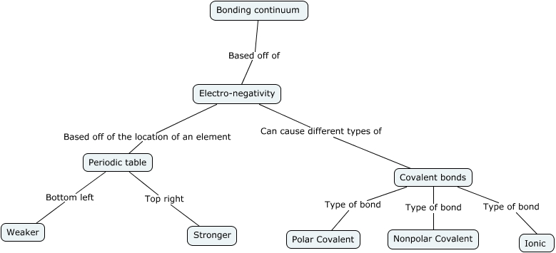 This Concept Map, created with IHMC CmapTools, has information related to: Electronegativity, Periodic table Top right Stronger, Covalent bonds Type of bond Polar Covalent, Electro-negativity Based off of the location of an element Periodic table, Periodic table Bottom left Weaker, Bonding continuum Based off of Electro-negativity, Electro-negativity Can cause different types of Covalent bonds, Covalent bonds Type of bond Ionic, Covalent bonds Type of bond Nonpolar Covalent