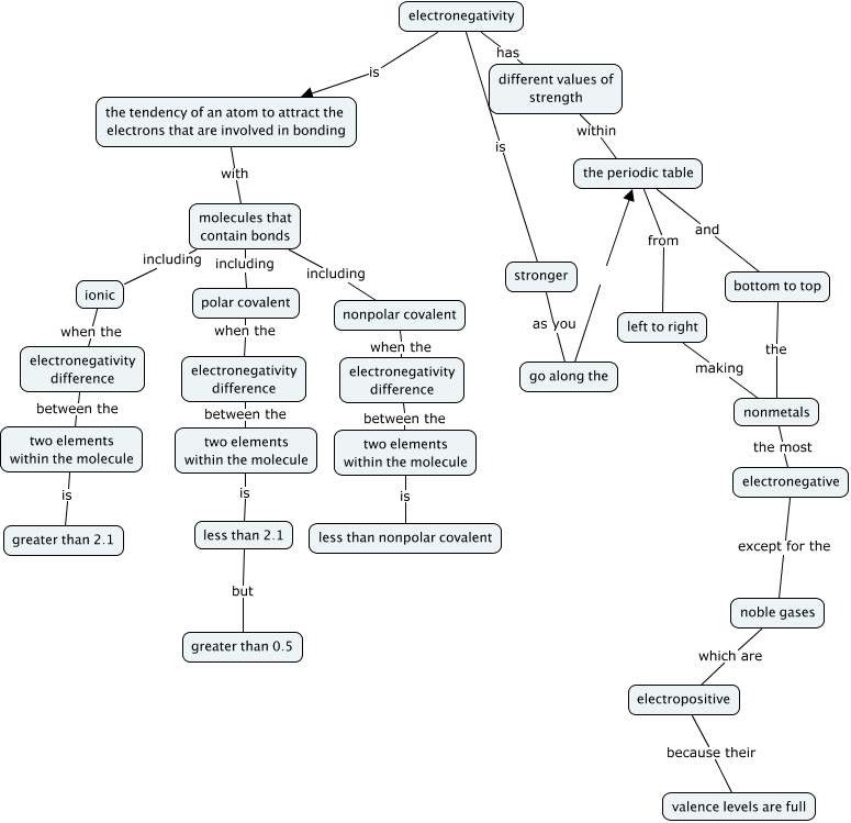 This Concept Map, created with IHMC CmapTools, has information related to: electronegativity, different values of strength within the periodic table, nonmetals the most electronegative, noble gases which are electropositive, less than 2.1 but greater than 0.5, electronegativity has different values of strength, the periodic table from left to right, the periodic table and bottom to top, electronegativity is stronger, the tendency of an atom to attract the electrons that are involved in bonding with molecules that contain bonds, ionic when the electronegativity difference, electronegative except for the noble gases, polar covalent when the electronegativity difference, stronger as you go along the, molecules that contain bonds including nonpolar covalent, electropositive because their valence levels are full, two elements within the molecule is greater than 2.1, molecules that contain bonds including polar covalent, two elements within the molecule is less than 2.1, bottom to top the nonmetals, nonpolar covalent when the electronegativity difference