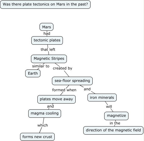 This Concept Map, created with IHMC CmapTools, has information related to: Plate Tectonics on Mars, Magnetic Stripes created by sea-floor spreading, sea-floor spreading and iron minerals, sea-floor spreading formed when plates move away, magma cooling which forms new crust, tectonic plates that left Magnetic Stripes, Mars had tectonic plates, magnetize in the direction of the magnetic field, plates move away and magma cooling, iron minerals will magnetize, Magnetic Stripes similar to Earth
