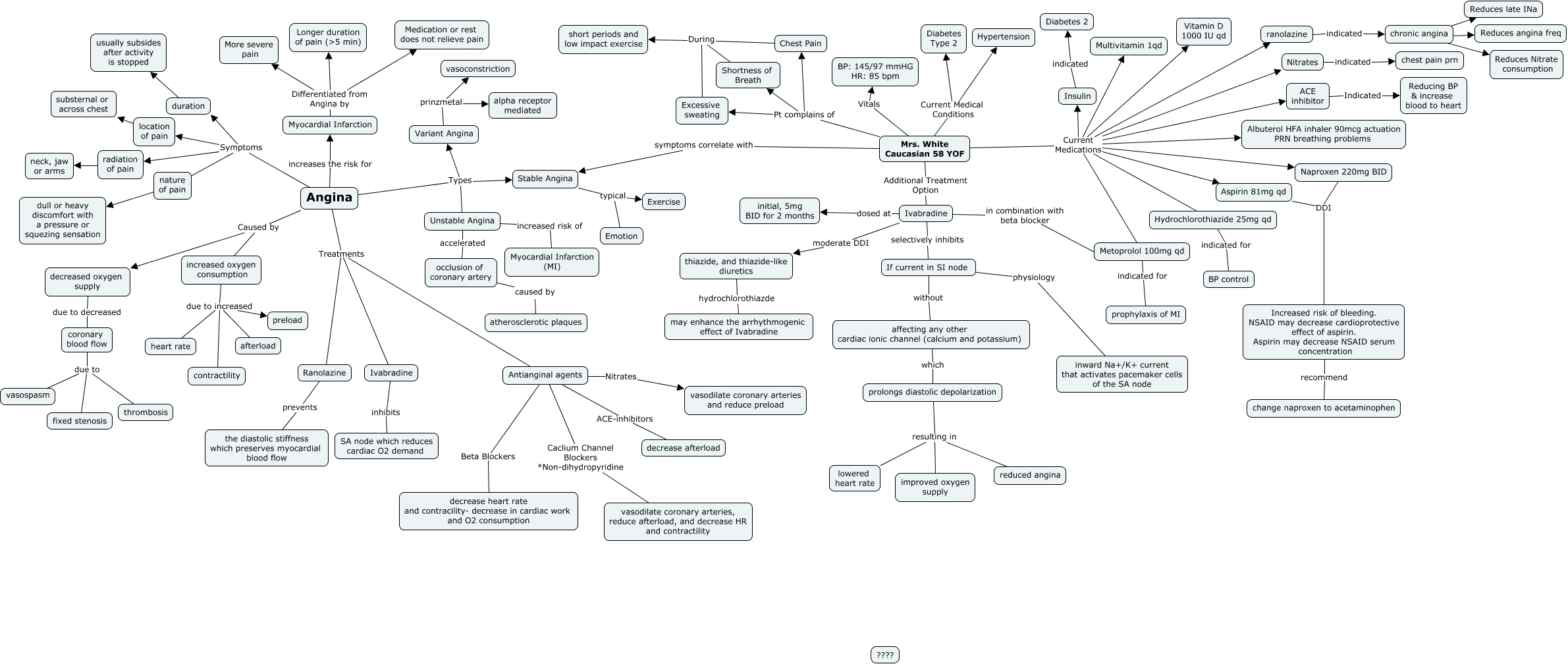 This Concept Map, created with IHMC CmapTools, has information related to: Michaela edits of Angina, Antianginal agents ACE-inhibitors decrease afterload, Ivabradine selectively inhibits If current in SI node, Ranolazine prevents the diastolic stiffness which preserves myocardial blood flow, Ivabradine inhibits SA node which reduces cardiac O2 demand, Antianginal agents Nitrates vasodilate coronary arteries and reduce preload, coronary blood flow due to vasospasm, ACE inhibitor Indicated Reducing BP & increase blood to heart, Angina Treatments Ranolazine, Ivabradine moderate DDI thiazide, and thiazide-like diuretics, chronic angina ???? Reduces late INa, occlusion of coronary artery caused by atherosclerotic plaques, Stable Angina typical Emotion, Mrs. White Caucasian 58 YOF Pt complains of Chest Pain, Mrs. White Caucasian 58 YOF Current Medications Albuterol HFA inhaler 90mcg actuation PRN breathing problems, Mrs. White Caucasian 58 YOF Current Medications Naproxen 220mg BID, Mrs. White Caucasian 58 YOF Current Medical Conditions Diabetes Type 2, Mrs. White Caucasian 58 YOF Current Medications Multivitamin 1qd, Variant Angina prinzmetal vasoconstriction, prolongs diastolic depolarization resulting in lowered heart rate, Mrs. White Caucasian 58 YOF Pt complains of Shortness of Breath