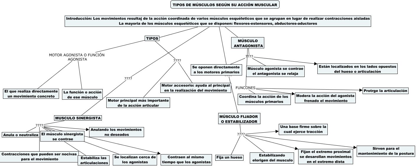 Este Cmap, tiene información relacionada con: tema 4, TIPOS ???? Motor principal más importante de la acción articular, MÚSCULO FIJADOR O ESTABILIZADOR ???? Una base firme sobre la cual ejerce tracción, MÚSCULO ANTAGONISTA ???? Se oponen directamente a los motores primarios, MÚSCULO ANTAGONISTA ???? Están localizados en los lados opuestos del hueso o articulación, MÚSCULO ANTAGONISTA FUNCONES Modera la acción del agonista frenado el movimiento, MUSCULO SINERGISTA ???? El músculo sinergista se contrae, MUSCULO SINERGISTA ???? Estabiliza las articulaciones, Introducción: Los movimientos resultaj de la acción coordinada de varios músculos esquéleticos que se agrupan en lugar de realizar contracciones aisladas La mayoria de los músculos esqueléticos que se disponen: flexores-estensores, abductores-aductores ???? TIPOS, MÚSCULO FIJADOR O ESTABILIZADOR ???? Fijan el extremo proximal se desarollan movimientos en el extremo dista, MUSCULO SINERGISTA ???? Se localizan cerca de los agonistas, MÚSCULO FIJADOR O ESTABILIZADOR ???? Estabilizando elorigen del musculo, MUSCULO SINERGISTA ???? Contraen al mismo tiempo que los agonistas, TIPOS MOTOR AGONISTA O FUNCIÓN AGONISTA La función o acción de ese músculo, TIPOS ???? Motor accesorio: ayuda al principal en la realización del movimiento, MUSCULO SINERGISTA ???? Contracciones que pueden ser nocivas para el movimiento, MÚSCULO FIJADOR O ESTABILIZADOR ???? Sirven para el mantenimiento de la postura, MUSCULO SINERGISTA ???? Anula o neutraliza, MUSCULO SINERGISTA ???? Anulando los movimientos no deseados, MÚSCULO ANTAGONISTA ???? Músculo agonista se contrae el antagonista se relaja, TIPOS MOTOR AGONISTA O FUNCIÓN AGONISTA El que realiza directamente un movimiento concreto