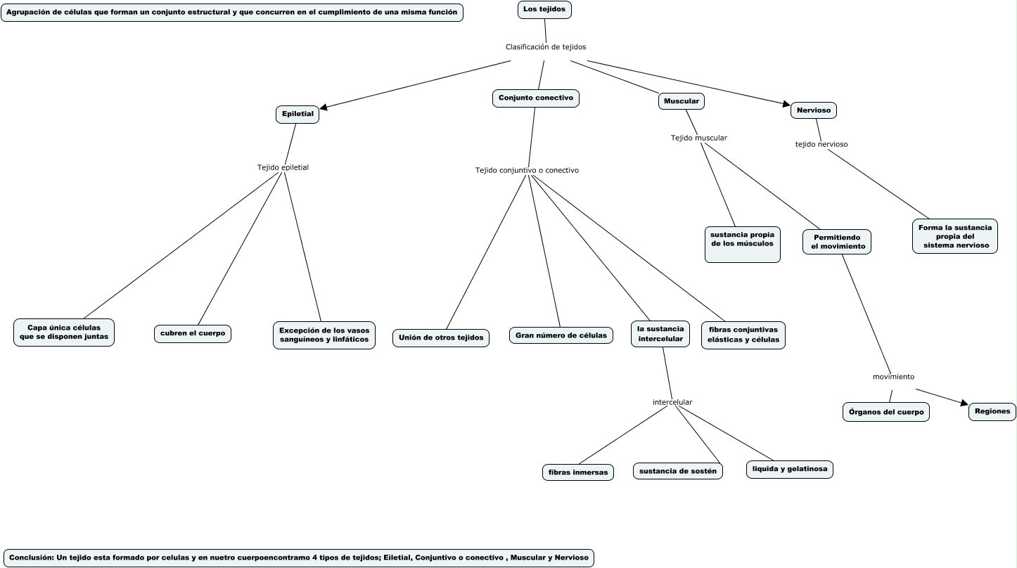 Este Cmap, tiene información relacionada con: tema 1, Conjunto conectivo Tejido conjuntivo o conectivo Gran número de células, Los tejidos Clasificación de tejidos Muscular, Conjunto conectivo Tejido conjuntivo o conectivo Unión de otros tejidos, Los tejidos Clasificación de tejidos Epiletial, la sustancia intercelular intercelular fibras inmersas, Muscular Tejido muscular sustancia propia de los músculos, Los tejidos Clasificación de tejidos Conjunto conectivo, Epiletial Tejido epiletial cubren el cuerpo, Epiletial Tejido epiletial Capa única células que se disponen juntas, Permitiendo el movimiento movimiento Órganos del cuerpo, la sustancia intercelular intercelular liquida y gelatinosa, Permitiendo el movimiento movimiento Regiones, Epiletial Tejido epiletial Excepción de los vasos sanguíneos y linfáticos, Conjunto conectivo Tejido conjuntivo o conectivo fibras conjuntivas elásticas y células, la sustancia intercelular intercelular sustancia de sostén, Conjunto conectivo Tejido conjuntivo o conectivo la sustancia intercelular, Muscular Tejido muscular Permitiendo el movimiento, Nervioso tejido nervioso Forma la sustancia propia del sistema nervioso, Los tejidos Clasificación de tejidos Nervioso