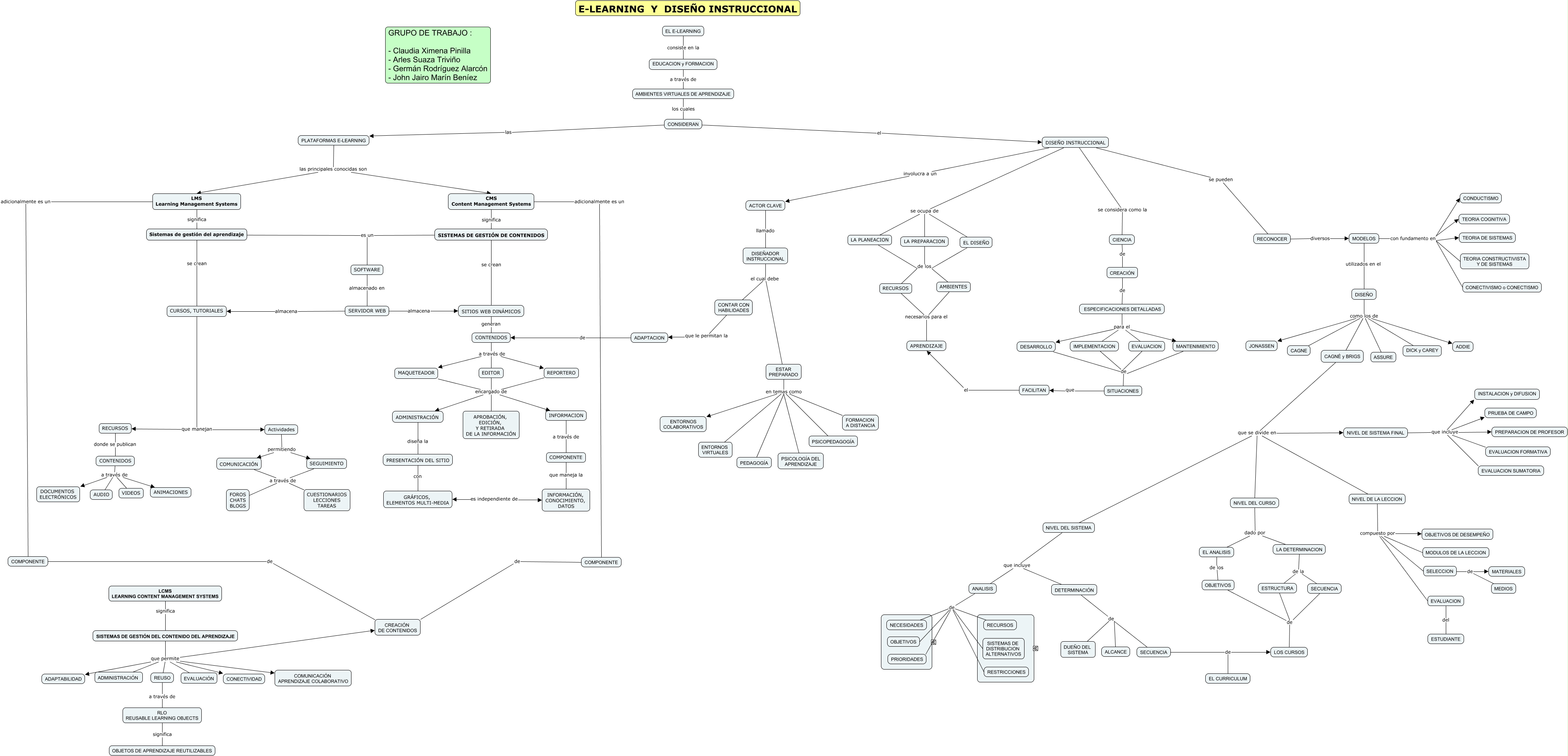 Este Cmap, tiene información relacionada con: E-LEARNING Y DI, ESPECIFICACIONES DETALLADAS para el DESARROLLO, CIENCIA de CREACIÓN, LA PLANEACION de los RECURSOS, DISEÑO como los de ASSURE, RLO REUSABLE LEARNING OBJECTS significa OBJETOS DE APRENDIZAJE REUTILIZABLES, COMPONENTE que maneja la INFORMACIÓN, CONOCIMIENTO, DATOS, OBJETIVOS de LOS CURSOS, DISEÑO como los de CAGNE, NIVEL DE SISTEMA FINAL que incluye EVALUACION FORMATIVA, DISEÑO INSTRUCCIONAL se considera como la CIENCIA, CONTENIDOS a través de VIDEOS, CAGNÉ y BRIGS que se divide en NIVEL DE SISTEMA FINAL, LA DETERMINACION de la ESTRUCTURA, REUSO a través de RLO REUSABLE LEARNING OBJECTS, CONTENIDOS a través de AUDIO, NIVEL DE LA LECCION compuesto por OBJETIVOS DE DESEMPEÑO, FACILITAN el APRENDIZAJE, SOFTWARE almacenado en SERVIDOR WEB, DISEÑO INSTRUCCIONAL se ocupa de LA PLANEACION, SELECCION de MEDIOS
