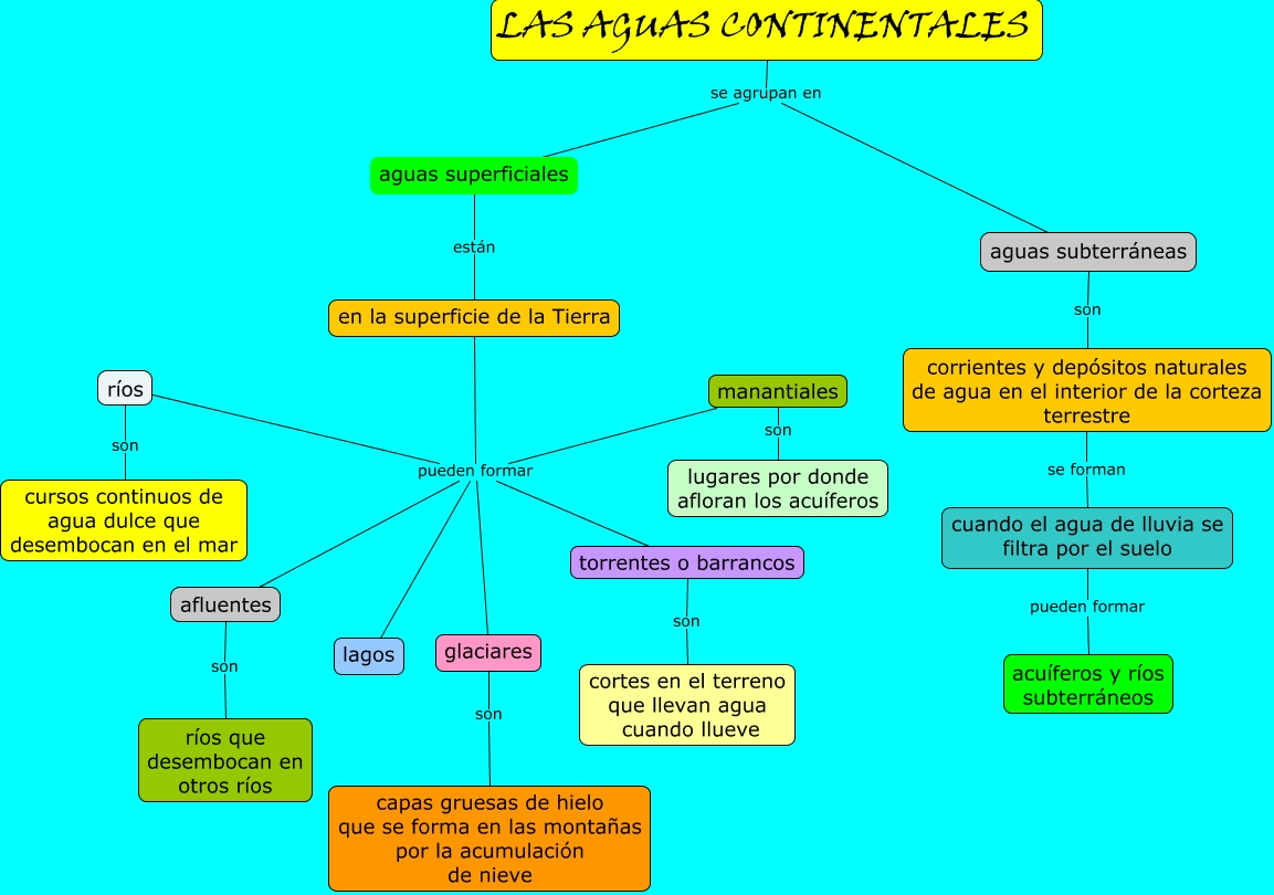 Este Cmap, tiene información relacionada con: Las aguas continentales, en la superficie de la Tierra pueden formar afluentes, afluentes son ríos que desembocan en otros ríos, en la superficie de la Tierra pueden formar ríos, en la superficie de la Tierra pueden formar manantiales, ríos son cursos continuos de agua dulce que desembocan en el mar, torrentes o barrancos son cortes en el terreno que llevan agua cuando llueve, aguas superficiales están en la superficie de la Tierra, manantiales son lugares por donde afloran los acuíferos, en la superficie de la Tierra pueden formar lagos, glaciares son capas gruesas de hielo que se forma en las montañas por la acumulación de nieve, LAS AGUAS CONTINENTALES se agrupan en aguas subterráneas, cuando el agua de lluvia se filtra por el suelo pueden formar acuíferos y ríos subterráneos, aguas subterráneas son corrientes y depósitos naturales de agua en el interior de la corteza terrestre, en la superficie de la Tierra pueden formar glaciares, en la superficie de la Tierra pueden formar torrentes o barrancos, LAS AGUAS CONTINENTALES se agrupan en aguas superficiales, corrientes y depósitos naturales de agua en el interior de la corteza terrestre se forman cuando el agua de lluvia se filtra por el suelo