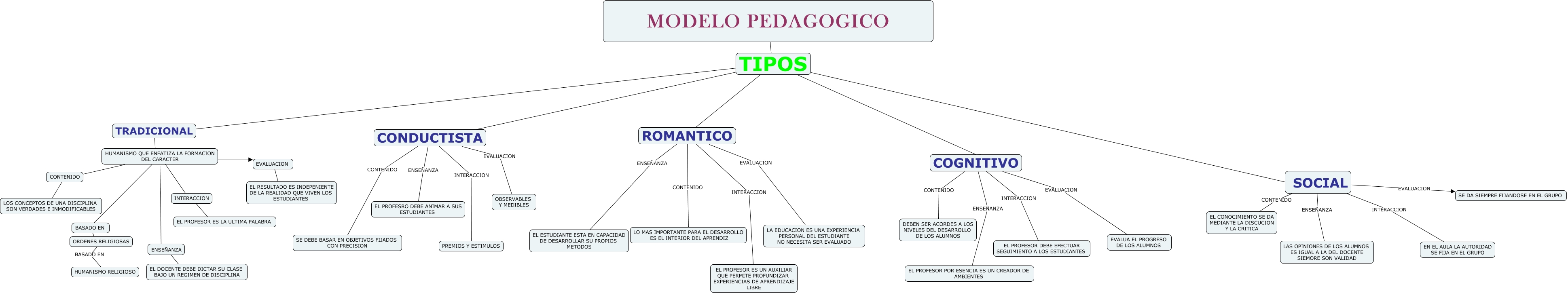 Este Cmap, tiene información relacionada con: MODELO PEDAGOGICO OSPINO, CONDUCTISTA ENSEÑANZA EL PROFESRO DEBE ANIMAR A SUS ESTUDIANTES, TIPOS ???? CONDUCTISTA, COGNITIVO EVALUACION EVALUA EL PROGRESO DE LOS ALUMNOS, SOCIAL ENSEÑANZA LAS OPINIONES DE LOS ALUMNOS ES IGUAL A LA DEL DOCENTE SIEMORE SON VALIDAD, ENSEÑANZA ???? EL DOCENTE DEBE DICTAR SU CLASE BAJO UN REGIMEN DE DISCIPLINA, EVALUACION ???? EL RESULTADO ES INDEPENIENTE DE LA REALIDAD QUE VIVEN LOS ESTUDIANTES, HUMANISMO QUE ENFATIZA LA FORMACION DEL CARACTER ???? BASADO EN, HUMANISMO QUE ENFATIZA LA FORMACION DEL CARACTER ???? INTERACCION, ROMANTICO CONTENIDO LO MAS IMPORTANTE PARA EL DESARROLLO ES EL INTERIOR DEL APRENDIZ, SOCIAL CONTENIDO EL CONOCIMIENTO SE DA MEDIANTE LA DISCUCION Y LA CRITICA, TIPOS ???? TRADICIONAL, ROMANTICO EVALUACION LA EDUCACION ES UNA EXPERIENCIA PERSONAL DEL ESTUDIANTE NO NECESITA SER EVALUADO, COGNITIVO ENSEÑANZA EL PROFESOR POR ESENCIA ES UN CREADOR DE AMBIENTES, TIPOS ???? ROMANTICO, TIPOS ???? COGNITIVO, BASADO EN ???? ORDENES RELIGIOSAS, ROMANTICO ENSEÑANZA EL ESTUDIANTE ESTA EN CAPACIDAD DE DESARROLLAR SU PROPIOS METODOS, TIPOS ???? CONDUCTISTA, SOCIAL EVALUACION SE DA SIEMPRE FIJANDOSE EN EL GRUPO, CONDUCTISTA CONTENIDO SE DEBE BASAR EN OBJETIVOS FIJADOS CON PRECISION