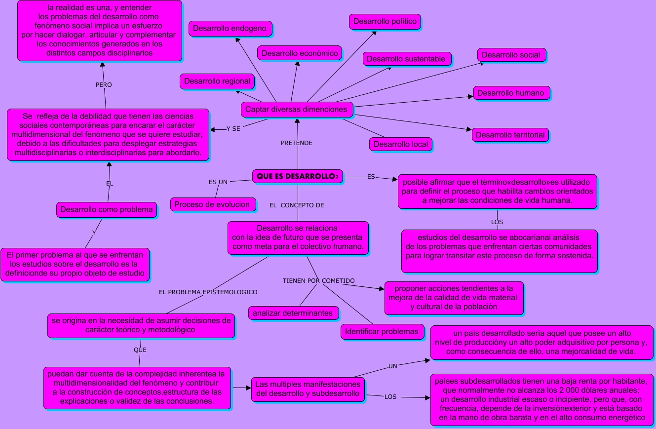 Este Cmap, tiene información relacionada con: QUE EL EL DESARROLLO, Captar diversas dimenciones ???? Desarrollo endogeno, Desarrollo se relaciona con la idea de futuro que se presenta como meta para el colectivo humano. TIENEN POR COMETIDO analizar determinantes, Desarrollo se relaciona con la idea de futuro que se presenta como meta para el colectivo humano. TIENEN POR COMETIDO Identificar problemas, Captar diversas dimenciones ???? Desarrollo humano, QUE ES DESARROLLO? ES UN Proceso de evolucion, Desarrollo como problema Y El primer problema al que se enfrentan los estudios sobre el desarrollo es la definicionde su propio objeto de estudio, Las multiples manifestaciones del desarrollo y subdesarrollo UN un país desarrollado sería aquel que posee un alto nivel de produccióny un alto poder adquisitivo por persona y, como consecuencia de ello, una mejorcalidad de vida., QUE ES DESARROLLO? ES posible afirmar que el término«desarrollo»es utilizado para definir el proceso que habilita cambios orientados a mejorar las condiciones de vida humana., QUE ES DESARROLLO? EL CONCEPTO DE Desarrollo se relaciona con la idea de futuro que se presenta como meta para el colectivo humano., Captar diversas dimenciones EL Desarrollo territorial, Las multiples manifestaciones del desarrollo y subdesarrollo LOS países subdesarrollados tienen una baja renta por habitante, que normalmente no alcanza los 2 000 dólares anuales; un desarrollo industrial escaso o incipiente, pero que, con frecuencia, depende de la inversiónexterior y está basado en la mano de obra barata y en el alto consumo energético, Desarrollo se relaciona con la idea de futuro que se presenta como meta para el colectivo humano. EL PROBLEMA EPISTEMOLOGICO se origina en la necesidad de asumir decisiones de carácter teórico y metodológico, Desarrollo como problema EL Se refleja de la debilidad que tienen las ciencias sociales contemporáneas para encarar el carácter multidimensional del fenómeno que se quiere estudiar, debido a las dificultades para desplegar estrategias multidisciplinarias o interdisciplinarias para abordarlo., Desarrollo se relaciona con la idea de futuro que se presenta como meta para el colectivo humano. TIENEN POR COMETIDO proponer acciones tendientes a la mejora de la calidad de vida material y cultural de la población, Captar diversas dimenciones Y SE Se refleja de la debilidad que tienen las ciencias sociales contemporáneas para encarar el carácter multidimensional del fenómeno que se quiere estudiar, debido a las dificultades para desplegar estrategias multidisciplinarias o interdisciplinarias para abordarlo., Captar diversas dimenciones EL Desarrollo político, Captar diversas dimenciones EL Desarrollo local, puedan dar cuenta de la complejidad inherentea la multidimensionalidad del fenómeno y contribuir a la construcción de conceptos,estructura de las explicaciones o validez de las conclusiones. ???? Las multiples manifestaciones del desarrollo y subdesarrollo, Se refleja de la debilidad que tienen las ciencias sociales contemporáneas para encarar el carácter multidimensional del fenómeno que se quiere estudiar, debido a las dificultades para desplegar estrategias multidisciplinarias o interdisciplinarias para abordarlo. PERO la realidad es una, y entender los problemas del desarrollo como fenómeno social implica un esfuerzo por hacer dialogar, articular y complementar los conocimientos generados en los distintos campos disciplinarios, QUE ES DESARROLLO? PRETENDE Captar diversas dimenciones