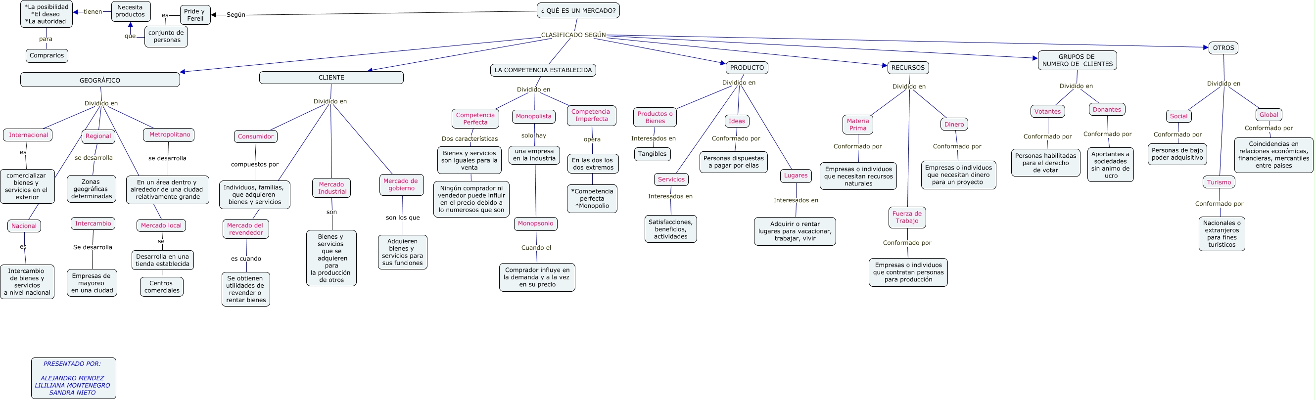 Este Cmap, tiene información relacionada con: LOS MERCADOS, Consumidor compuestos por Individuos, familias, que adquieren bienes y servicios, Nacional es Intercambio de bienes y servicios a nivel nacional, GRUPOS DE NUMERO DE CLIENTES Dividido en Votantes, RECURSOS Dividido en Fuerza de Trabajo, PRODUCTO Dividido en Servicios, RECURSOS Dividido en Materia Prima, CLIENTE Dividido en Mercado de gobierno, Productos o Bienes Interesados en Tangibles, Intercambio Se desarrolla Empresas de mayoreo en una ciudad, ¿ QUÉ ES UN MERCADO? Según Pride y Ferell, Ideas Conformado por Personas dispuestas a pagar por ellas, Fuerza de Trabajo Conformado por Empresas o individuos que contratan personas para producción, PRODUCTO Dividido en Productos o Bienes, conjunto de personas que Necesita productos, LA COMPETENCIA ESTABLECIDA Dividido en Monopolista, Necesita productos tienen *La posibilidad *El deseo *La autoridad, Mercado del revendedor es cuando Se obtienen utilidades de revender o rentar bienes, Social Conformado por Personas de bajo poder adquisitivo, Monopolista solo hay una empresa en la industria, OTROS Dividido en Global
