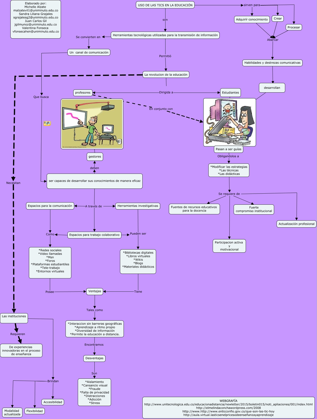 Este Cmap, tiene información relacionada con: cmaptool valen, Desventajas Son *Aislamiento *Cansancio visual *Fraude *Falta de privacidad *Distracciones *Adicción *Stress, Estudiantes ????, Espacios para la comunicación Como *Redes sociales *Video llamadas *Msn *Foros *Plataformas estudiantiles *Tele-trabajo *Entornos virtuales, gestores ???? ????, Herramientas investigativas Pueden ser *Bibliotecas digitales *Libros virtuales *Wikis *Blogs *Materiales didácticos, USO DE LAS TICS EN LA EDUCACIÓN sirven para Adquirír conocimiento, ser capaces de desarrollar sus conocimientos de manera eficaz A través de Herramientas investigativas, ser capaces de desarrollar sus conocimientos de manera eficaz A través de Espacios para la comunicación, Procesar Abarcar Habilidades y destrezas comunicativas, profesores En conjunto con, Espacios para trabajo colaborativo Pueden ser *Bibliotecas digitales *Libros virtuales *Wikis *Blogs *Materiales didácticos, Crear Abarcar Habilidades y destrezas comunicativas, La revolucion de la educación Dirigida a profesores, Herramientas tecnológicas utilizadas para la transmisión de información Se convierten en Un canal de comunicación, USO DE LAS TICS EN LA EDUCACIÓN son Herramientas tecnológicas utilizadas para la transmisión de información, *Modificar las estrategias *Las técnicas *Las didácticas Se requiere de Actualización profesional, Las instituciones Brindan Flexibilidad, La revolucion de la educación Dirigida a Estudiantes, ser capaces de desarrollar sus conocimientos de manera eficaz deben gestores, USO DE LAS TICS EN LA EDUCACIÓN sirven para Procesar