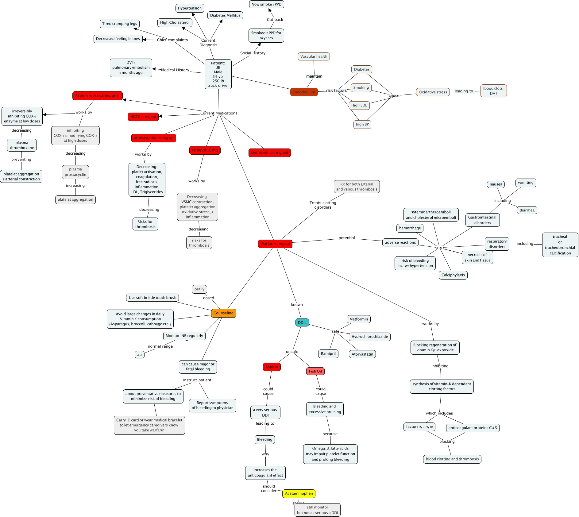 This Concept Map, created with IHMC CmapTools, has information related to: DVT, about preventative measures to minimize risk of bleeding ???? Carry ID card or wear medical bracelet to let emergency caregivers know you take warfarin, Counseling ???? can cause major or fatal bleeding, adverse reactions are Gastrointestinal disorders, Counseling dosed orally, Oxidative stress leading to lbood clots: DVT, Monitor INR regularly normal range 2-3, adverse reactions are risk of bleeding inc. w/ hypertension, Decreasing: VSMC contraction, platelet aggregation oxidative stress, & inflammation decreasing risks for thrombosis, Fish Oil could cause Bleeding and excessive bruising, respiratory disorders including tracheal or tracheobronchial calcification, Endothelium maintain Vascular health, anticoagulant proteins C & S blocking blood clotting and thrombosis, Counseling ???? Avoid large changes in daily Vitamin K consumption (Asparagus, broccoli, cabbage etc.), Endothelium risk factors high BP, inhibiting COX-1 & modifying COX-2 at high doses decreasing plasma prostacyclin, Patient: JE Male 54 yo 250 lb truck driver Current Medications HCTZ 25 mg qd, synthesis of vitamin-K dependent clotting factors which includes anticoagulant proteins C & S, Patient: JE Male 54 yo 250 lb truck driver Chief complaints Decreased feeling in toes, Warfarin 5 mg qd Treats clotting disorders Rx for both arterial and venous thrombosis, Aspirin could cause a very serious DDI
