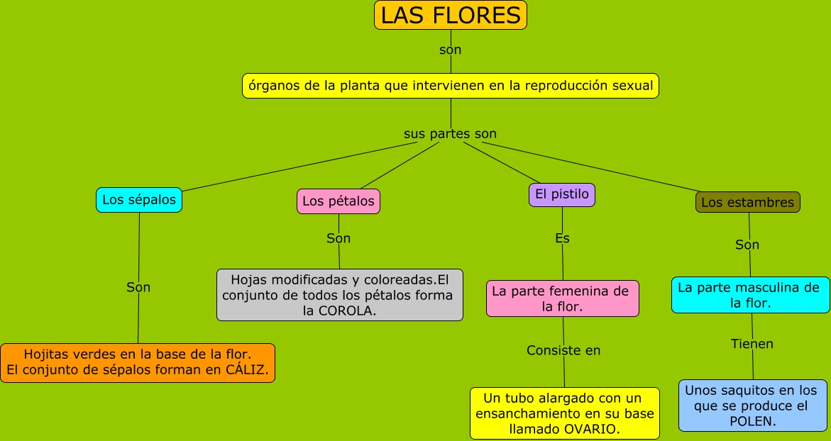 Este Cmap, tiene información relacionada con: Las flores, El pistilo Es La parte femenina de la flor., La parte femenina de la flor. Consiste en Un tubo alargado con un ensanchamiento en su base llamado OVARIO., LAS FLORES son órganos de la planta que intervienen en la reproducción sexual, Los estambres Son La parte masculina de la flor., Los pétalos Son Hojas modificadas y coloreadas.El conjunto de todos los pétalos forma la COROLA., órganos de la planta que intervienen en la reproducción sexual sus partes son Los estambres, órganos de la planta que intervienen en la reproducción sexual sus partes son Los sépalos, La parte masculina de la flor. Tienen Unos saquitos en los que se produce el POLEN., Los sépalos Son Hojitas verdes en la base de la flor. El conjunto de sépalos forman en CÁLIZ., órganos de la planta que intervienen en la reproducción sexual sus partes son El pistilo, órganos de la planta que intervienen en la reproducción sexual sus partes son Los pétalos