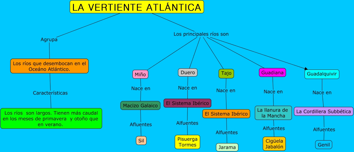 Este Cmap, tiene información relacionada con: La vertiente Atlántica, La Cordillera Subbética Alfuentes Genil, LA VERTIENTE ATLÁNTICA Los principales ríos son Tajo, LA VERTIENTE ATLÁNTICA Agrupa Los ríos que desembocan en el Oceáno Atlántico., El Sistema Ibérico Alfuentes Pisuerga Tormes, Guadalquivir Nace en La Cordillera Subbética, LA VERTIENTE ATLÁNTICA Los principales ríos son Guadalquivir, LA VERTIENTE ATLÁNTICA Los principales ríos son Duero, Guadiana Nace en La llanura de la Mancha, Macizo Galaico Afluentes Sil, Duero Nace en El Sistema Ibérico, La llanura de la Mancha Alfuentes Cigüela Jabalón, Miño Nace en Macizo Galaico, Los ríos que desembocan en el Oceáno Atlántico. Características Los ríos son largos. Tienen más caudal en los meses de primavera y otoño que en verano., LA VERTIENTE ATLÁNTICA Los principales ríos son Miño, Tajo Nace en El Sistema Ibérico, LA VERTIENTE ATLÁNTICA Los principales ríos son Guadiana, El Sistema Ibérico Alfuentes Jarama