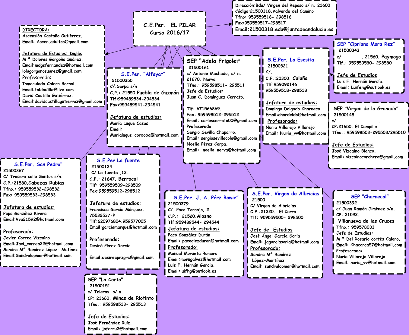 Este Cmap, tiene información relacionada con: CEPER EL PILAR, C.E.Per. EL PILAR Curso 2016/17 ???? SEP “Charnecal” 21500392 c/ Juan Ramón Jiménez s/n. CP: 21592. Villanueva de las Cruces Tfno.: 959578033 Jefe de Estudios: M ª Del Rosario cortés Calero, Email: Chacorca57@hotmail.com Profesorado: Nuria Villarejo Villarejo. Email: nuria_vv@hotmail.com, C.E.Per. EL PILAR Curso 2016/17 ???? S.E.Per. J. A. Pérz Bowie” 21500379 C/. Paco Toronjo, 2. C.P.: 21520.Alosno Tlf:959489544- 294544 Jefatura de estudios: Paco González Durán Email: pacoglezduran@hotmail.com Profesorado: Manuel Morueta Romero Email:morugalvez@hotmail.com Luis F. Hernán Garcia. Email:luifhg@outlook.es, C.E.Per. EL PILAR Curso 2016/17 ???? S.E.Per. San Pedro” 21500367 C/.Trasera calle Santos s/n. C.P.:21580.Cabezas Rubias Tfno.: 959559532-298532 Fax: 959559533-298533 Jefatura de estudios: Pepa González Rivera Email:Vva21592@hotmail.com Profesorado: Javier Correa Vizcaíno Email:Javi_correa22@hotmail.com Sandra Mª Ramírez López- Matínez Email:Sandralopmar@hotmail.com, C.E.Per. EL PILAR Curso 2016/17 ???? SEP “Adela Frigolet” 21500161 c/ Antonio Machado, s/ n. 21670. Nerva Tfno.: 959598511- 295511 Jefe de Estudios: Juan C. Domínguez Cerrato. Tlf: 671566869. Fax: 959598512-295512 Email: carloscerrato00@gmail.com Profesorado: Sergio Sevilla Chaparro. Email: sergiosevillacole@gmail.com Noelia Pérez Cerpa. Email: noelia_nerva@hotmail.com, C.E.Per. EL PILAR Curso 2016/17 ???? SEP “La Corta” 21500151 c/ Teleras s/ n. CP: 21660. Minas de Riotinto Tfno.: 959598513- 295513 Jefe de Estudios: José Fernández Ruiz. Email: joferru2@hotmail.com, C.E.Per. EL PILAR Curso 2016/17 ???? DIRECTORA: Ascensión Castaño Gutiérrez. Email: Ascen.adultos@gmail.com Jefatura de Estudios: Inglés M ª Dolores Gorgoño Suárez. Email:mdgsfernandez@hotmail.com lolagorgonosuarez@gmail.com Profesorado: Inmaculada Calero Bernal. Email:tabladilla@live.com David Castilla Gutiérrez. Email:davidcastillagutierrez@gmail.com, C.E.Per. EL PILAR Curso 2016/17 ???? S.E.Per. “Alfayat” 21500355 C/.Serpa s/n C.P.: 21550.Puebla de Guzmán Tlf:959489534-294534 Fax:959489541-294541 Jefatura de estudios: María Luque Casas Email: Marialuque_cordoba@hotmail.com, C.E.Per. EL PILAR Curso 2016/17 ???? Dirección:Bda/ Virgen del Reposo s/ n. 21600 Código:21500318.Valverde del Camino Tfno: 959559516- 298516 Fax:959559517-298517 Email:21500318.edu@juntadeandalucia.es, C.E.Per. EL PILAR Curso 2016/17 ???? S.E.Per. Virgen de Albricias 21500 C/.Virgen de Albricias C.P.:21320. El Cerro Tlf: 959559500- 298500 Jefe de Estudios José Ángel García Soria Email: jagarciasoria@hotmail.com Profesorado: Sandra Mª Ramírez López-Martínez Email: sandralopmar@hotmail.com, C.E.Per. EL PILAR Curso 2016/17 ???? S.E.Per. La Esesita 21500321 C/. C.P.:20300. Calaña Tlf:959092146 959559518-298518 Jefatura de estudios: Domingo Delgado Charneco Email:chardeldo@hotmail.com Profesorado: Nuria Villarejo Villarejo Email: Nuria_vv@hotmail.com, C.E.Per. EL PILAR Curso 2016/17 ???? SEP ”Cipriano Mora Rez” 21500343 c/ . 21560. Paymogo Tlf.: 959559530- 298530 Jefe de Estudios Luis F. Hernán García. Email: Luifehg@outlook.es, C.E.Per. EL PILAR Curso 2016/17 ???? S.E.Per.La fuente 21500124 C/.La fuente ,13. C.P.: 21647. Berrocal Tlf: 959559509-298509 Fax:959559512-298512 Jefatura de estudios: Francisca García Márquez. 75532537-P Tlf:620976804.959577005 Email:garciamarque@hotmail.com Profesorado: Desiré Pérez García Email:desireeprzgrc@gmail.com, C.E.Per. EL PILAR Curso 2016/17 ???? SEP “Virgen de la Granada” 21500148 c/ . CP:21650. El Campillo Tfno.: 959598503-295503/295510 Jefe de Estudios: José Vizcaíno Blanco. Email: vizcainocorchero@gmail.com
