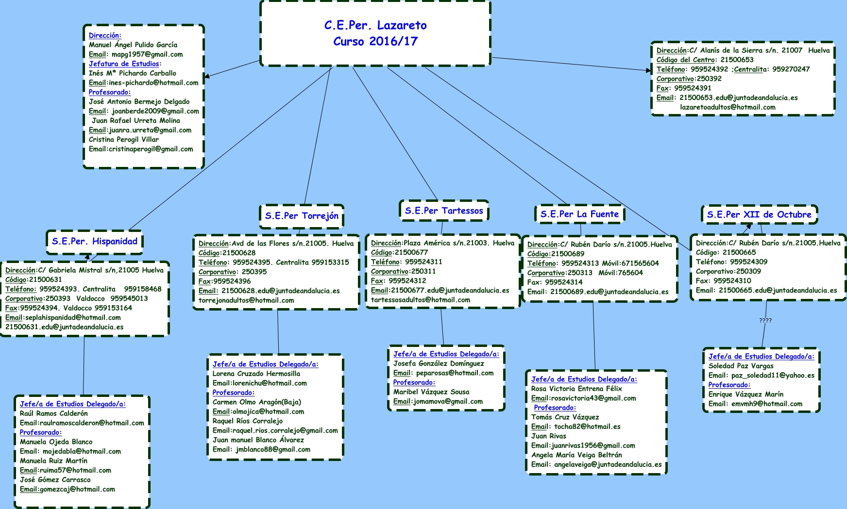 Este Cmap, tiene información relacionada con: CEPER LAZARETO, S.E.Per La Fuente ???? Dirección:C/ Rubén Darío s/n.21005.Huelva Código:21500689 Teléfono: 959524313 Móvil:671565604 Corporativo:250313 Móvil:765604 Fax: 959524314 Email: 21500689.edu@juntadeandalucia.es, C.E.Per. Lazareto Curso 2016/17 ???? S.E.Per XII de Octubre, Dirección:C/ Rubén Darío s/n.21005.Huelva Código: 21500665 Teléfono: 959524309 Corporativo:250309 Fax: 959524310 Email: 21500665.edu@juntadeandalucia.es ???? Jefe/a de Estudios Delegado/a: Soledad Paz Vargas Email: paz_soledad11@yahoo.es Profesorado: Enrique Vázquez Marín Email: emvmh9@hotmail.com, Dirección:Avd de las Flores s/n.21005. Huelva Código:21500628 Teléfono: 959524395. Centralita 959153315 Corporativo: 250395 Fax:959524396 Email: 21500628.edu@juntadeandalucia.es torrejonadultos@hotmail.com ???? Jefe/a de Estudios Delegado/a: Lorena Cruzado Hermosilla Email:lorenichu@hotmail.com Profesorado: Carmen Olmo Aragón(Baja) Email:olmojica@hotmail.com Raquel Ríos Corralejo Email:raquel.rios.corralejo@gmail.com Juan manuel Blanco Álvarez Email: jmblanco88@gmail.com, S.E.Per XII de Octubre ???? Dirección:C/ Rubén Darío s/n.21005.Huelva Código: 21500665 Teléfono: 959524309 Corporativo:250309 Fax: 959524310 Email: 21500665.edu@juntadeandalucia.es, S.E.Per Torrejón ???? Dirección:Avd de las Flores s/n.21005. Huelva Código:21500628 Teléfono: 959524395. Centralita 959153315 Corporativo: 250395 Fax:959524396 Email: 21500628.edu@juntadeandalucia.es torrejonadultos@hotmail.com, Dirección:C/ Gabriela Mistral s/n,21005 Huelva Código:21500631 Teléfono: 959524393. Centralita 959158468 Corporativo:250393 Valdocco 959545013 Fax:959524394. Valdocco 959153164 Email:seplahispanidad@hotmail.com 21500631.edu@juntadeandalucia.es ???? Jefe/a de Estudios Delegado/a: Raúl Ramos Calderón Email:raulramoscalderon@hotmail.com Profesorado: Manuela Ojeda Blanco Email: mojedabla@hotmail.com Manuela Ruiz Martín Email:ruima57@hotmail.com José Gómez Carrasco Email:gomezcaj@hotmail.com, Dirección:C/ Rubén Darío s/n.21005.Huelva Código:21500689 Teléfono: 959524313 Móvil:671565604 Corporativo:250313 Móvil:765604 Fax: 959524314 Email: 21500689.edu@juntadeandalucia.es ???? Jefe/a de Estudios Delegado/a: Rosa Victoria Entrena Félix Email:rosavictoria43@gmail.com Profesorado: Tomás Cruz Vázquez Email: tocha82@hotmail.es Juan Rivas Email:juanrivas1956@gmail.com Angela María Veiga Beltrán Email: angelaveiga@juntadeandalucia.es, C.E.Per. Lazareto Curso 2016/17 ???? S.E.Per. Hispanidad, C.E.Per. Lazareto Curso 2016/17 ???? S.E.Per La Fuente, S.E.Per Tartessos ???? S.E.Per Torrejón, Dirección:Plaza América s/n.21003. Huelva Código:21500677 Teléfono: 959524311 Corporativo:250311 Fax: 959524312 Email:21500677.edu@juntadeandalucia.es tartessosadultos@hotmail.com ???? Jefe/a de Estudios Delegado/a: Josefa González Domínguez Email: peparosas@hotmail.com Profesorado: Maribel Vázquez Sousa Email:jomamova@gmail.com, C.E.Per. Lazareto Curso 2016/17 ???? Dirección: Manuel Ángel Pulido García Email: mapg1957@gmail.com Jefatura de Estudios: Inés Mª Pichardo Carballo Email:ines-pichardo@hotmail.com Profesorado: José Antonio Bermejo Delgado Email: joanberde2009@gmail.com Juan Rafael Urreta Molina Email:juanra.urreta@gmail.com Cristina Perogil Villar Email:cristinaperogil@gmail.com, C.E.Per. Lazareto Curso 2016/17 ???? Dirección:C/ Alanís de la Sierra s/n. 21007 Huelva Código del Centro: 21500653 Teléfono: 959524392 ;Centralita: 959270247 Corporativo:250392 Fax: 959524391 Email: 21500653.edu@juntadeandalucia.es lazaretoadultos@hotmail.com, S.E.Per Tartessos ???? Dirección:Plaza América s/n.21003. Huelva Código:21500677 Teléfono: 959524311 Corporativo:250311 Fax: 959524312 Email:21500677.edu@juntadeandalucia.es tartessosadultos@hotmail.com