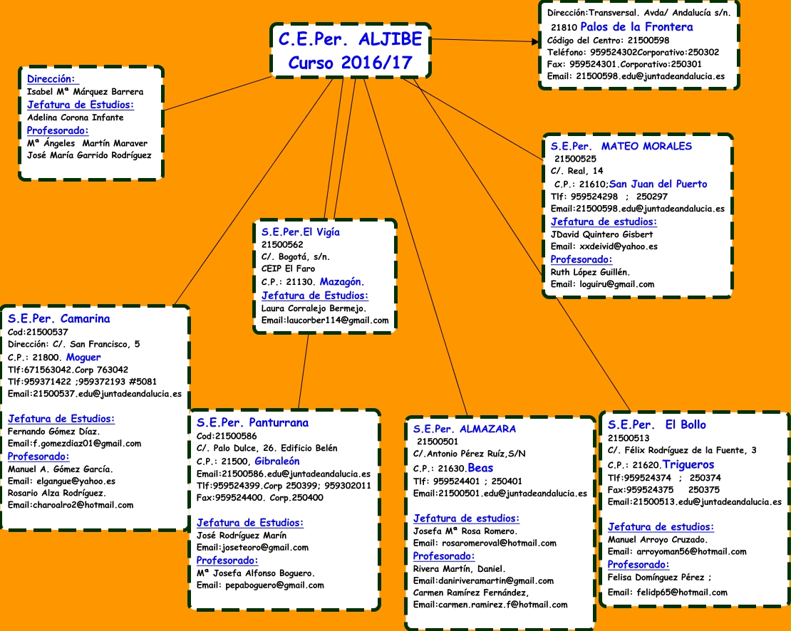 Este Cmap, tiene información relacionada con: CEPER ALJIBE, C.E.Per. ALJIBE Curso 2016/17 ???? S.E.Per. Camarina Cod:21500537 Dirección: C/. San Francisco, 5 C.P.: 21800. Moguer Tlf:671563042.Corp 763042 Tlf:959371422 ;959372193 #5081 Email:21500537.edu@juntadeandalucia.es Jefatura de Estudios: Fernando Gómez Díaz. Email:f.gomezdiaz01@gmail.com Profesorado: Manuel A. Gómez García. Email: elgangue@yahoo.es Rosario Alza Rodríguez. Email:charoalro2@hotmail.com, C.E.Per. ALJIBE Curso 2016/17 ???? S.E.Per. El Bollo 21500513 C/. Félix Rodríguez de la Fuente, 3 C.P.: 21620.Trigueros Tlf:959524374 ; 250374 Fax:959524375 250375 Email:21500513.edu@juntadeandalucia.es Jefatura de estudios: Manuel Arroyo Cruzado. Email: arroyoman56@hotmail.com Profesorado: Felisa Domínguez Pérez ; Email: felidp65@hotmail.com, C.E.Per. ALJIBE Curso 2016/17 ???? S.E.Per.El Vigía 21500562 C/. Bogotá, s/n. CEIP El Faro C.P.: 21130. Mazagón. Jefatura de Estudios: Laura Corralejo Bermejo. Email:laucorber114@gmail.com, C.E.Per. ALJIBE Curso 2016/17 ???? Dirección:Transversal. Avda/ Andalucía s/n. 21810 Palos de la Frontera Código del Centro: 21500598 Teléfono: 959524302Corporativo:250302 Fax: 959524301.Corporativo:250301 Email: 21500598.edu@juntadeandalucia.es, C.E.Per. ALJIBE Curso 2016/17 ???? Dirección: Isabel Mª Márquez Barrera Jefatura de Estudios: Adelina Corona Infante Profesorado: Mª Ángeles Martín Maraver José María Garrido Rodríguez, C.E.Per. ALJIBE Curso 2016/17 ???? S.E.Per. MATEO MORALES 21500525 C/. Real, 14 C.P.: 21610;San Juan del Puerto Tlf: 959524298 ; 250297 Email:21500598.edu@juntadeandalucia.es Jefatura de estudios: JDavid Quintero Gisbert Email: xxdeivid@yahoo.es Profesorado: Ruth López Guillén. Email: loguiru@gmail.com, C.E.Per. ALJIBE Curso 2016/17 ???? S.E.Per. ALMAZARA 21500501 C/.Antonio Pérez Ruíz,S/N C.P.: 21630.Beas Tlf: 959524401 ; 250401 Email:21500501.edu@juntadeandalucia.es Jefatura de estudios: Josefa Mª Rosa Romero. Email: rosaromeroval@hotmail.com Profesorado: Rivera Martín, Daniel. Email:daniriveramartin@gmail.com Carmen Ramírez Fernández, Email:carmen.ramirez.f@hotmail.com, C.E.Per. ALJIBE Curso 2016/17 ???? S.E.Per. Panturrana Cod:21500586 C/. Palo Dulce, 26. Edificio Belén C.P.: 21500, Gibraleón Email:21500586.edu@juntadeandalucia.es Tlf:959524399.Corp 250399; 959302011 Fax:959524400. Corp.250400 Jefatura de Estudios: José Rodríguez Marín Email:joseteoro@gmail.com Profesorado: Mª Josefa Alfonso Boguero. Email: pepaboguero@gmail.com