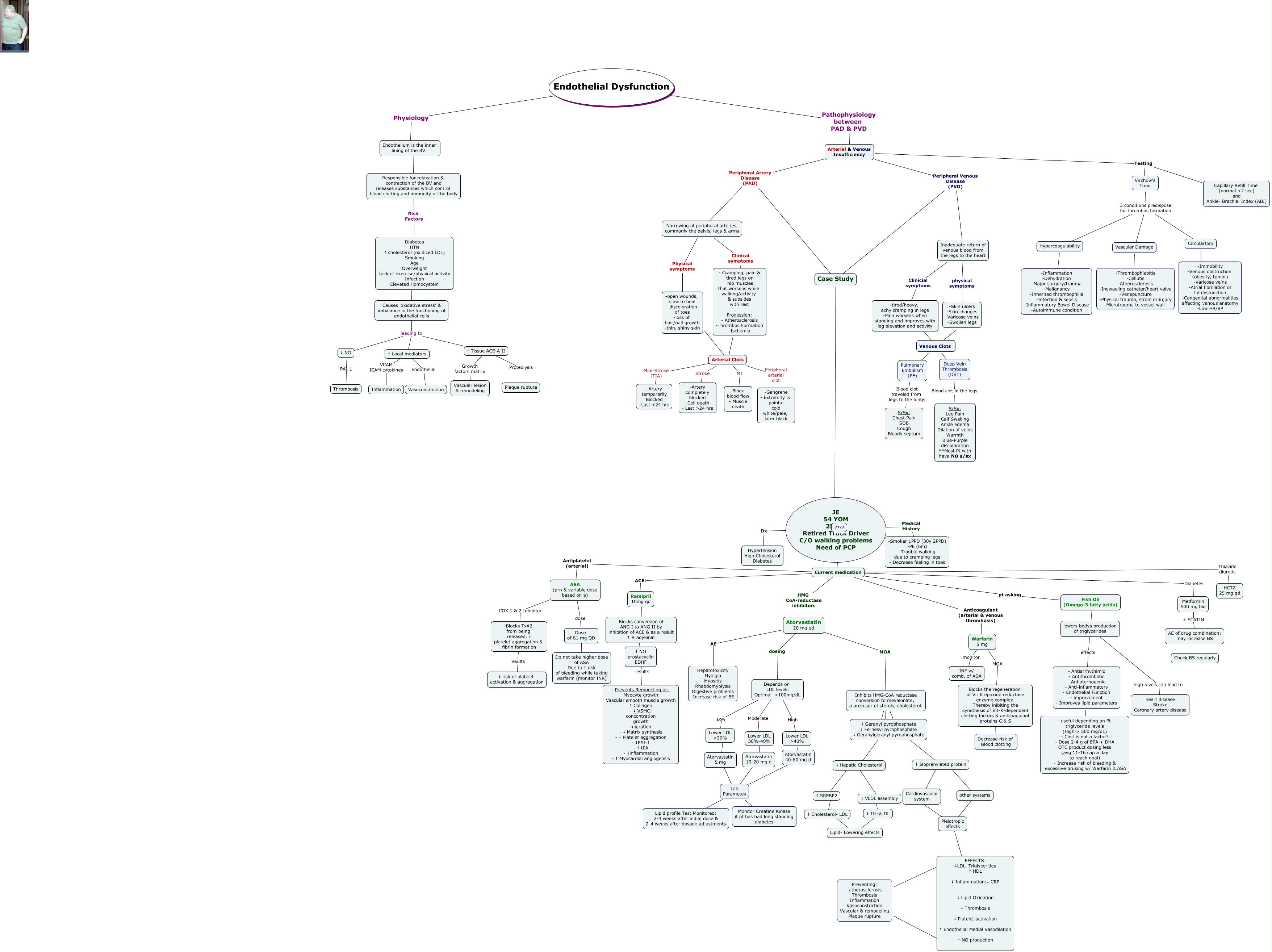 This Concept Map, created with IHMC CmapTools, has information related to: Jessica edits of PE, Atorvastatin 20 mg qd MOA Inhibits HMG-CoA reductase conversion to mevalonate, a precusor of sterols, cholesterol., EFFECTS: ↓LDL, Triglycerides ↑ HDL ↓ Inflammation:↓ CRP ↓ Lipid Oxidation ↓ Thrombosis ↓ Platelet activation ↑ Endothelial Medial Vasodilation ↑ NO production ???? Preventing: atherosclerosis Thrombosis Inflammation Vasoconstriction Vascular & remodeling Plaque rupture, Virchow's Triad 3 conditions predispose for thrombus formation Hypercoagulability, Circulartory ???? -Immobility -Venous obstruction (obesity, tumor) -Varicose veins -Atrial fibrillation or LV dysfunction -Congenital abnormalities affecting venous anatomy -Low HR/BP, Case Study Peripheral Artery Disease (PAD) Narrowing of peripheral arteries, commonly the pelvis, legs & arms, Endothelial Dysfunction Pathophysiology between PAD & PVD Arterial & Venous Insufficiency, ↑ Tissue ACE-A II Growth factors matrix Vascular lesion & remodeling, ↑ NO prostacyclin EDHF results - Prevents Remodeling of: Myocyte growth Vascular smooth muscle growth ↑ Collagen - ↓ VSMC: concontration growth migration - ↓ Matrix synthesis - ↓ Platelet aggregation - ↓PAI-1 - ↑ tPA - ↓inflammation - ↑ Myocardial angiogensis, Case Study Peripheral Venous Disease (PVD) Inadequate return of venous blood from the legs to the heart, Venous Clots ???? Deep Vein Thrombosis (DVT), Causes 'oxidative stress' & imbalance in the functioning of endothelial cells leading to ↑ Tissue ACE-A II, Depends on LDL levels Optimal mg/dL Moderate Lower LDL 30%-40%, ↑ SREBP2 ???? ↓ Cholesterol- LDL, Virchow's Triad Testing Arterial & Venous Insufficiency, Atorvastatin 20 mg qd dosing Depends on LDL levels Optimal mg/dL, Endothelium is the inner lining of the BV. ???? Responsible for relaxation & contraction of the BV and releases substances which control blood clotting and immunity of the body, ↑ Local mediators VCAM ICAM cytokines Inflammation, EFFECTS: ↓LDL, Triglycerides ↑ HDL ↓ Inflammation:↓ CRP ↓ Lipid Oxidation ↓ Thrombosis ↓ Platelet activation ↑ Endothelial Medial Vasodilation ↑ NO production ???? Pleiotropic effects, Current medication Diabetes Metformin 500 mg bid, ↑ Tissue ACE-A II Proteolysis Plaque rupture