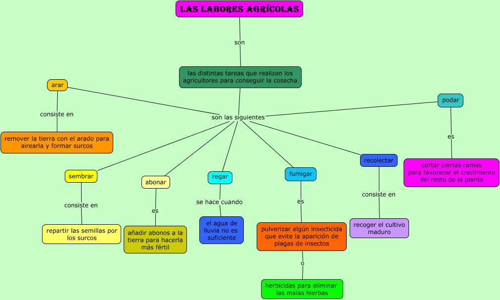 Este Cmap, tiene información relacionada con: Las labores agrícolas, abonar es añadir abonos a la tierra para hacerla más fértil, LAS LABORES AGRÍCOLAS son las distintas tareas que realizan los agricultores para conseguir la cosecha, las distintas tareas que realizan los agricultores para conseguir la cosecha son las siguientes regar, las distintas tareas que realizan los agricultores para conseguir la cosecha son las siguientes sembrar, arar consiste en remover la tierra con el arado para airearla y formar surcos, recolectar consiste en recoger el cultivo maduro, podar es cortar ciertas ramas para favorecer el crecimiento del resto de la planta, las distintas tareas que realizan los agricultores para conseguir la cosecha son las siguientes arar, las distintas tareas que realizan los agricultores para conseguir la cosecha son las siguientes recolectar, sembrar consiste en repartir las semillas por los surcos, las distintas tareas que realizan los agricultores para conseguir la cosecha son las siguientes fumigar, pulverizar algún insecticida que evite la aparición de plagas de insectos o herbicidas para eliminar las malas hierbas, las distintas tareas que realizan los agricultores para conseguir la cosecha son las siguientes abonar, las distintas tareas que realizan los agricultores para conseguir la cosecha son las siguientes podar, regar se hace cuando el agua de lluvia no es suficiente, fumigar es pulverizar algún insecticida que evite la aparición de plagas de insectos